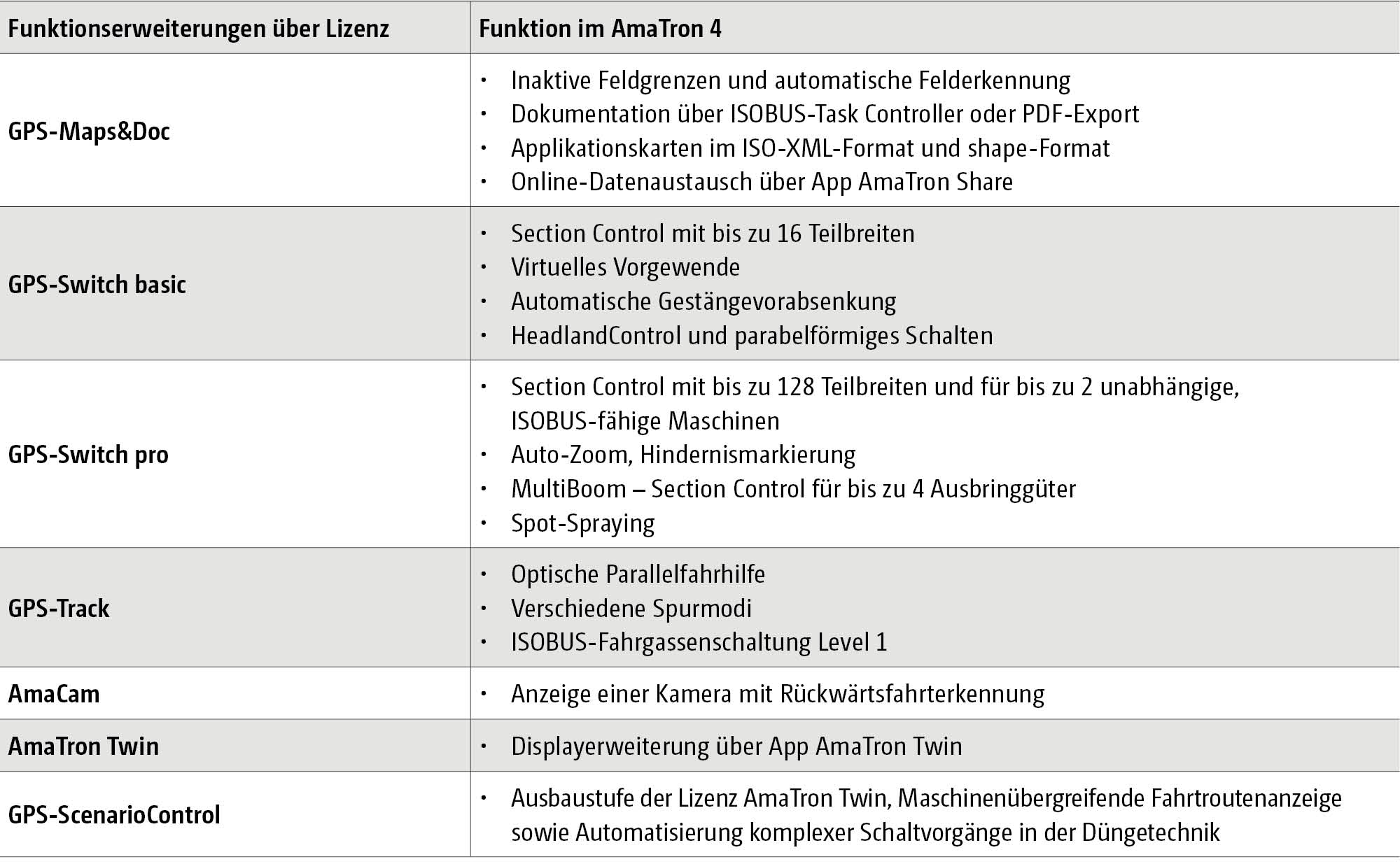 Software für jeden – ob für die reine ISOBUS-Maschinenbedienung oder für Funktionen der Präzisionslandwirtschaft – das AmaTron 4 bietet verschiedene optionale Softwarelizenzen und wird somit jedem Anspruch gerecht. Alle Lizenzen sind auf dem AmaTron 4 vorinstalliert und können kostenfrei getestet oder direkt kostenpflichtig freigeschaltet werden.