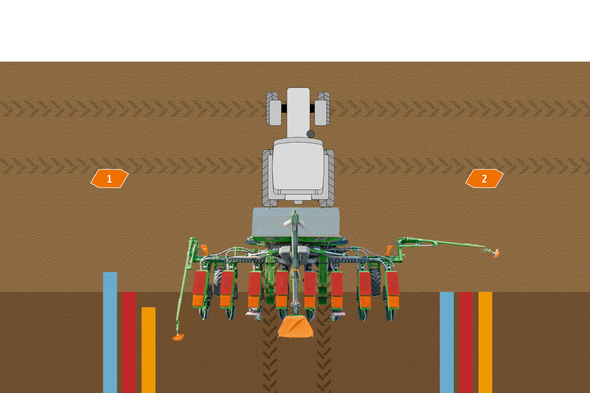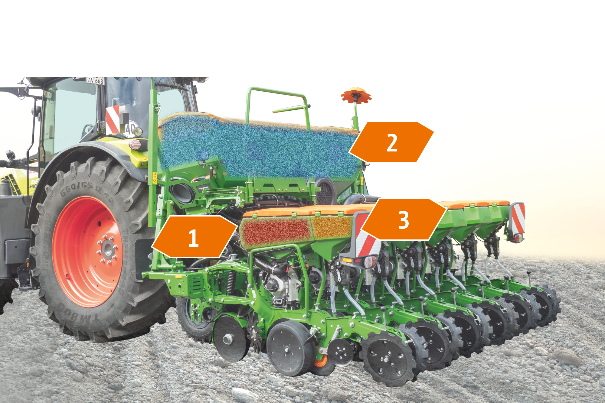 Durch den Einsatz von bis zu 3 Behältern können mehrere Applikationsgüter (1) Saatgut und 2) Dünger bzw. zusätzlich 3) Mikrogranulat) gleichzeitig und flexibel ausgebracht werden. Das spart Überfahrten und steigert die Düngeeffizienz durch präzise Unterfußdüngung.