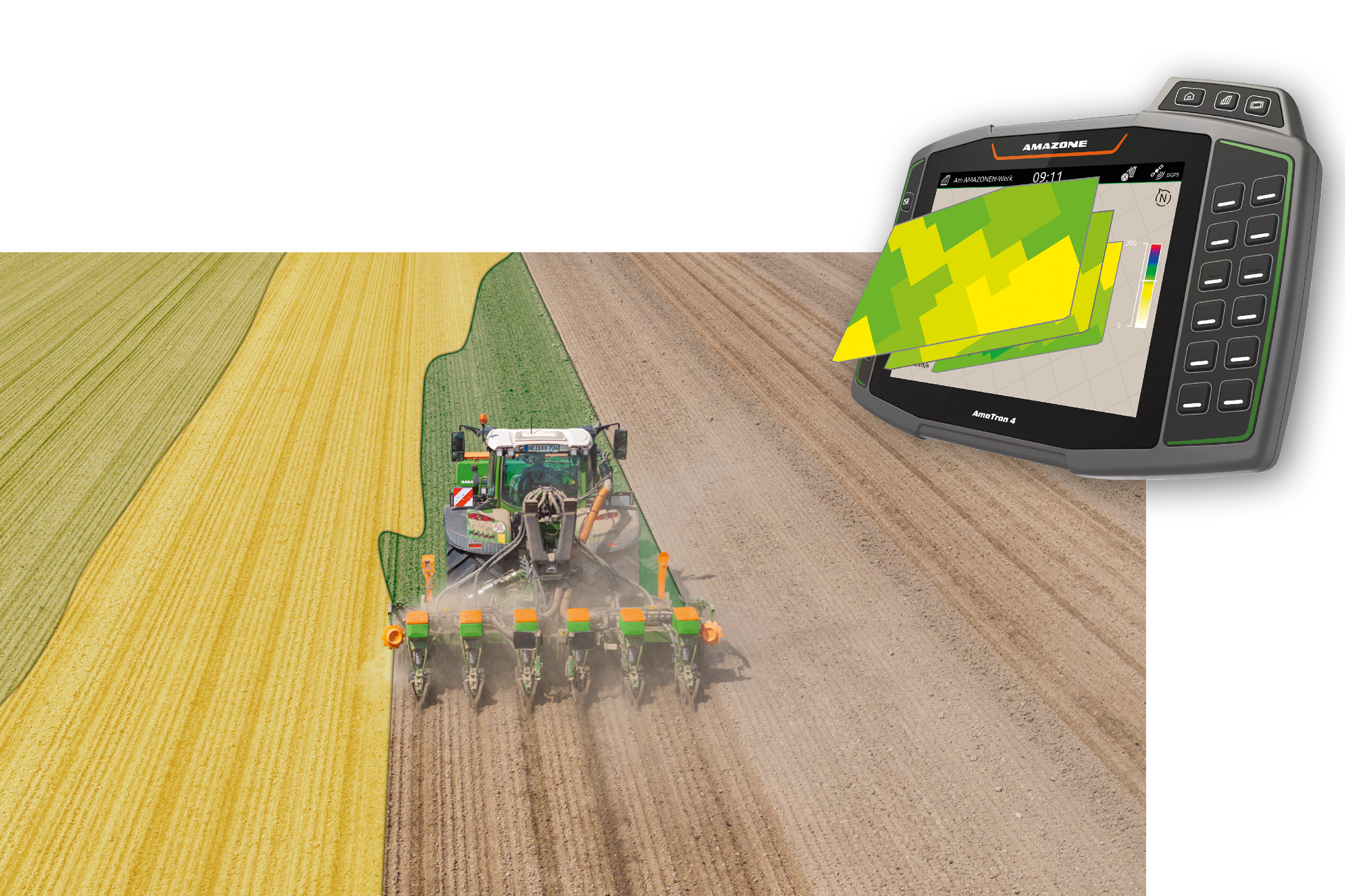 Sowohl Saatgut als auch Dünger sowie Mikrogranulate können angepasst an das unterschiedliche Ertragspotenzial innerhalb eines Schlages teilflächenspezifisch ausgebracht werden – unabhängig voneinander, auf Grundlage von bis zu 3 Applikationskarten mit der Lizenz GPS-Maps&Docs unter Verwendung des AmaTron 4.