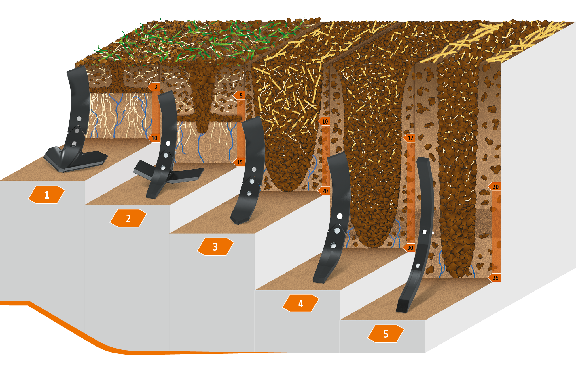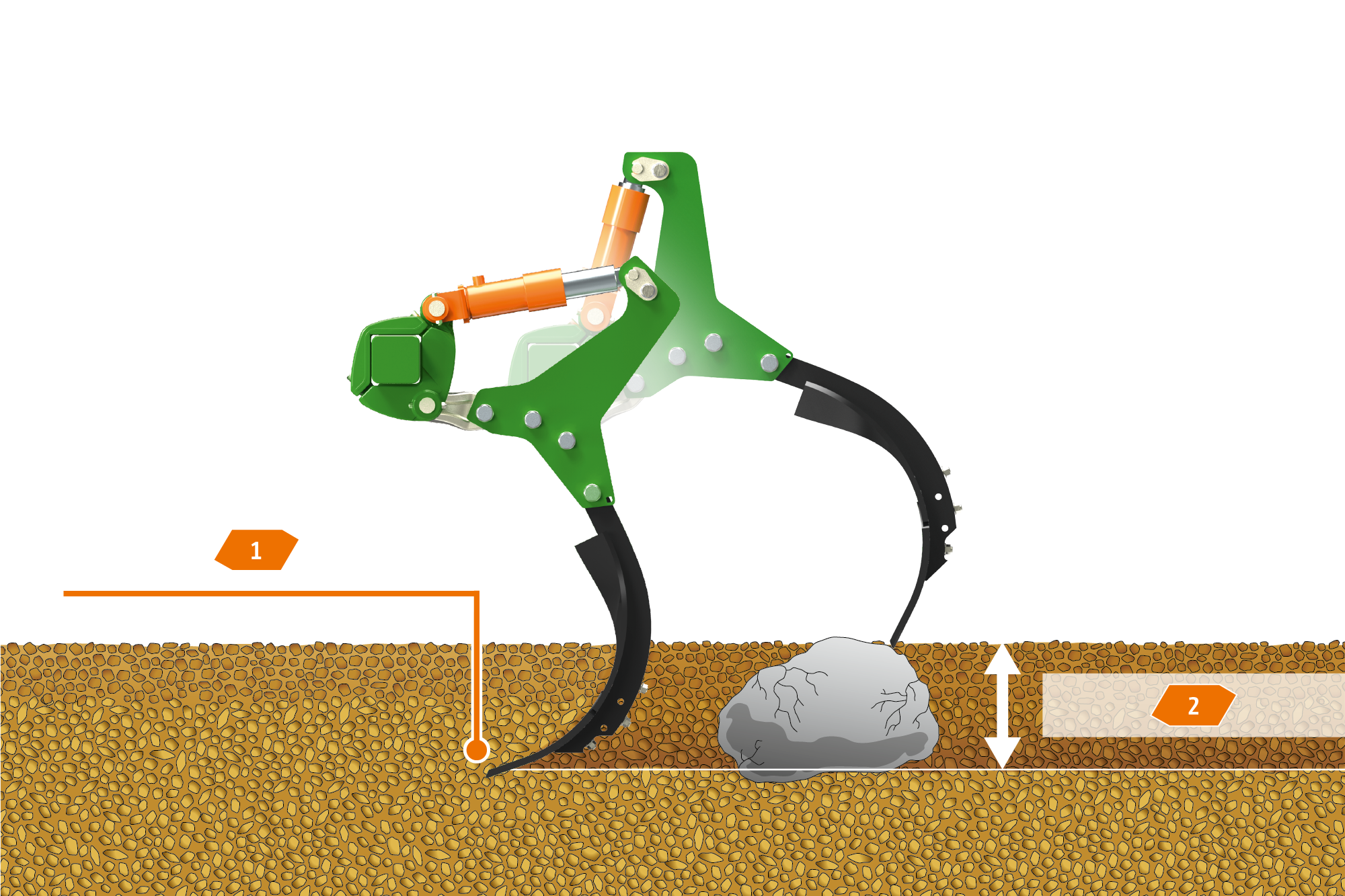 Der C-Mix-Ultra-Zinken zeigt seine Stärken besonders bei anspruchsvollen Bodenverhältnissen mit regelmäßiger Überlast beispielsweise bei Böden mit mittleren oder großen Steinen. Die Auslösekraft kann bei der hydraulischen Ultra-Überlastsicherung stufenlos von 500 kg auf bis zu 800 kg erhöht werden, so dass auch bei härtesten Bodenverhältnissen die Tiefe zuverlässig gehalten wird. Dadurch kann der Zinken auch bei einer Arbeitstiefe von 35 cm bei Bedarf maximal ausweichen. Der zentrale Hydraulikspeicher sorgt für ein gedämpftes Rückschlagverhalten des C-Mix-Ultra-Zinkens. Dadurch wird der Verschleiß der Überlastsicherung deutlich reduziert.