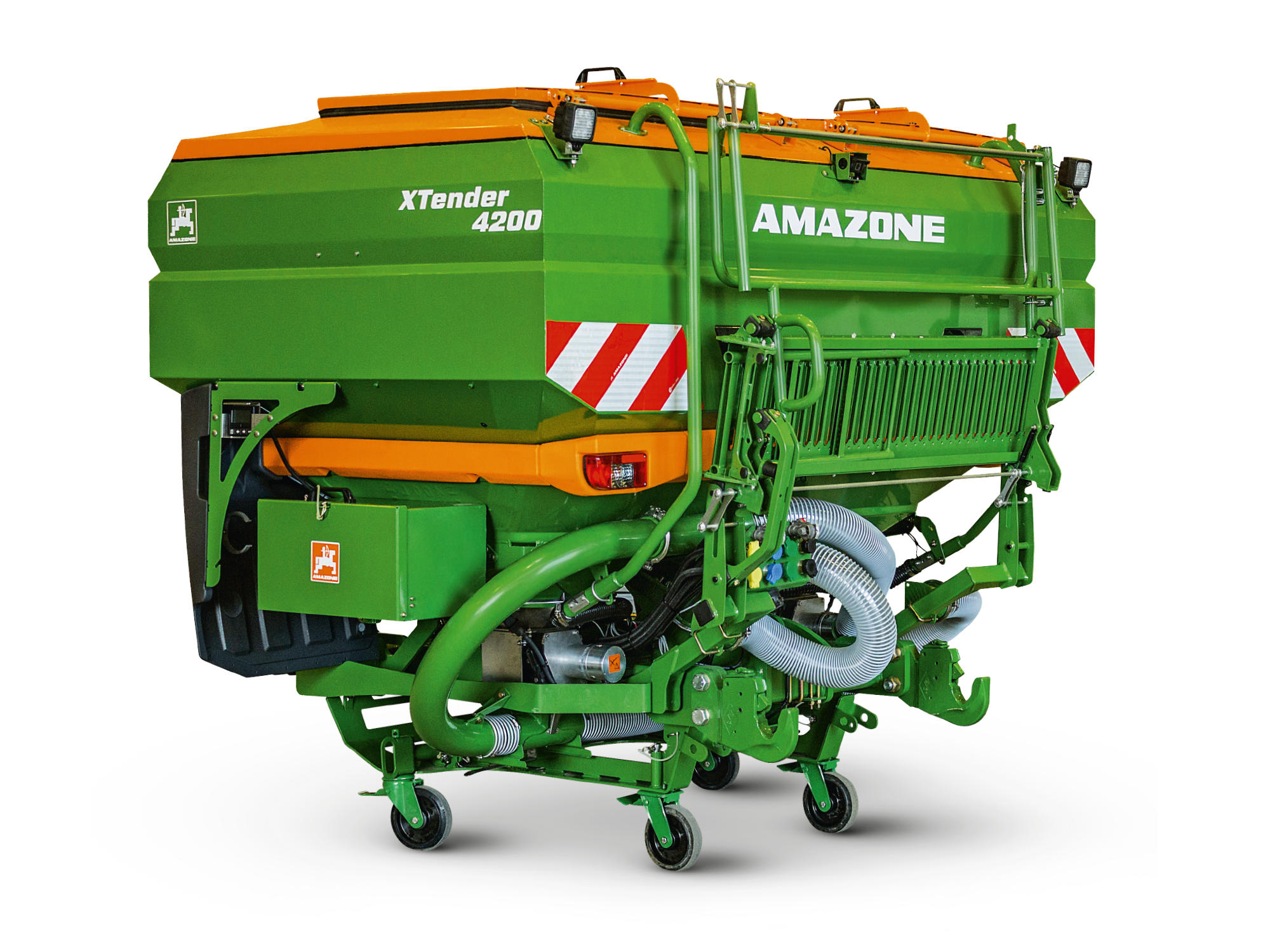 Mit dem XTender (angebaut) bietet AMAZONE ebenfalls auch zwei Heckbehälter mit Behältervolumen von 4.200 l an. Der Heckbehälter verfügt zudem über einen Zweikammer-Druckbehälter mit einer Behälterteilung von 50/50, sodass gleichzeitig zwei unterschiedliche Medien wie Dünger und Saatgut ausgebracht werden können.