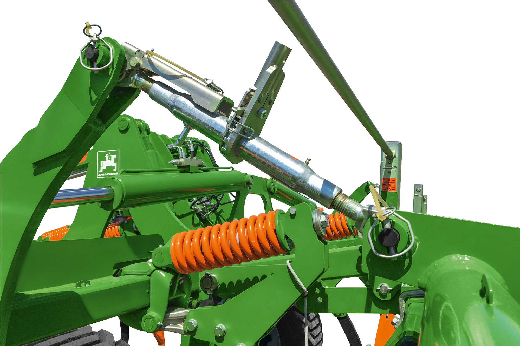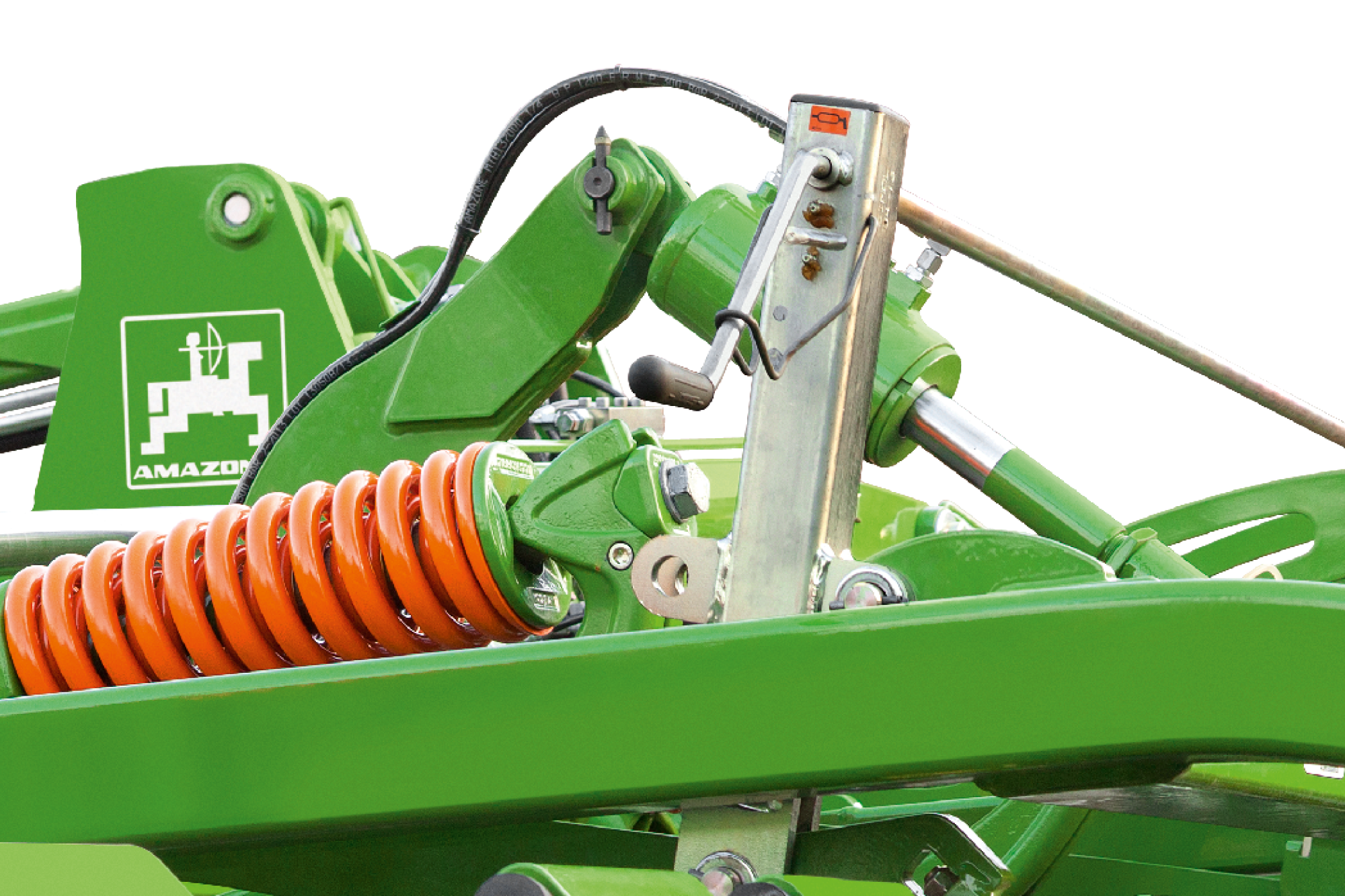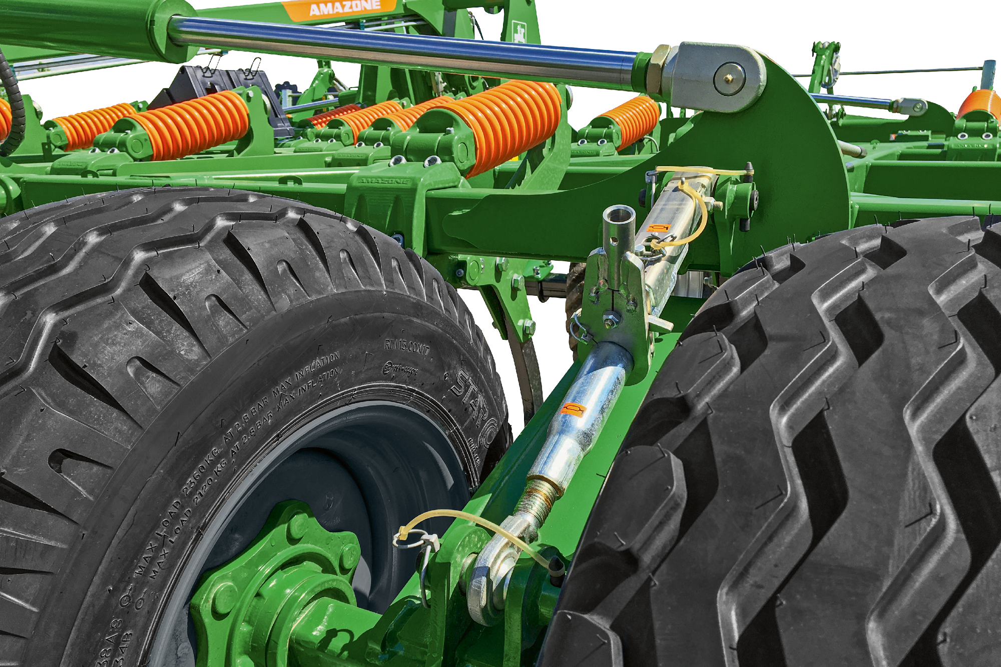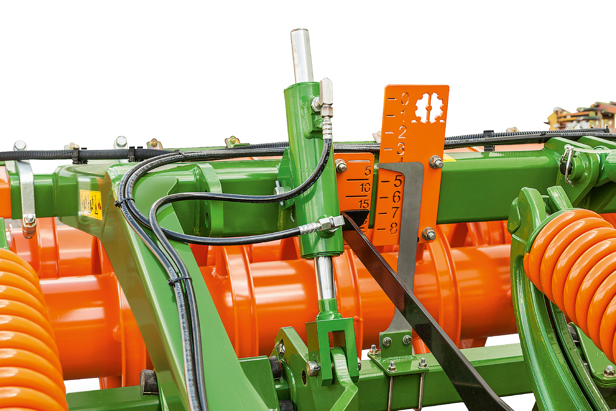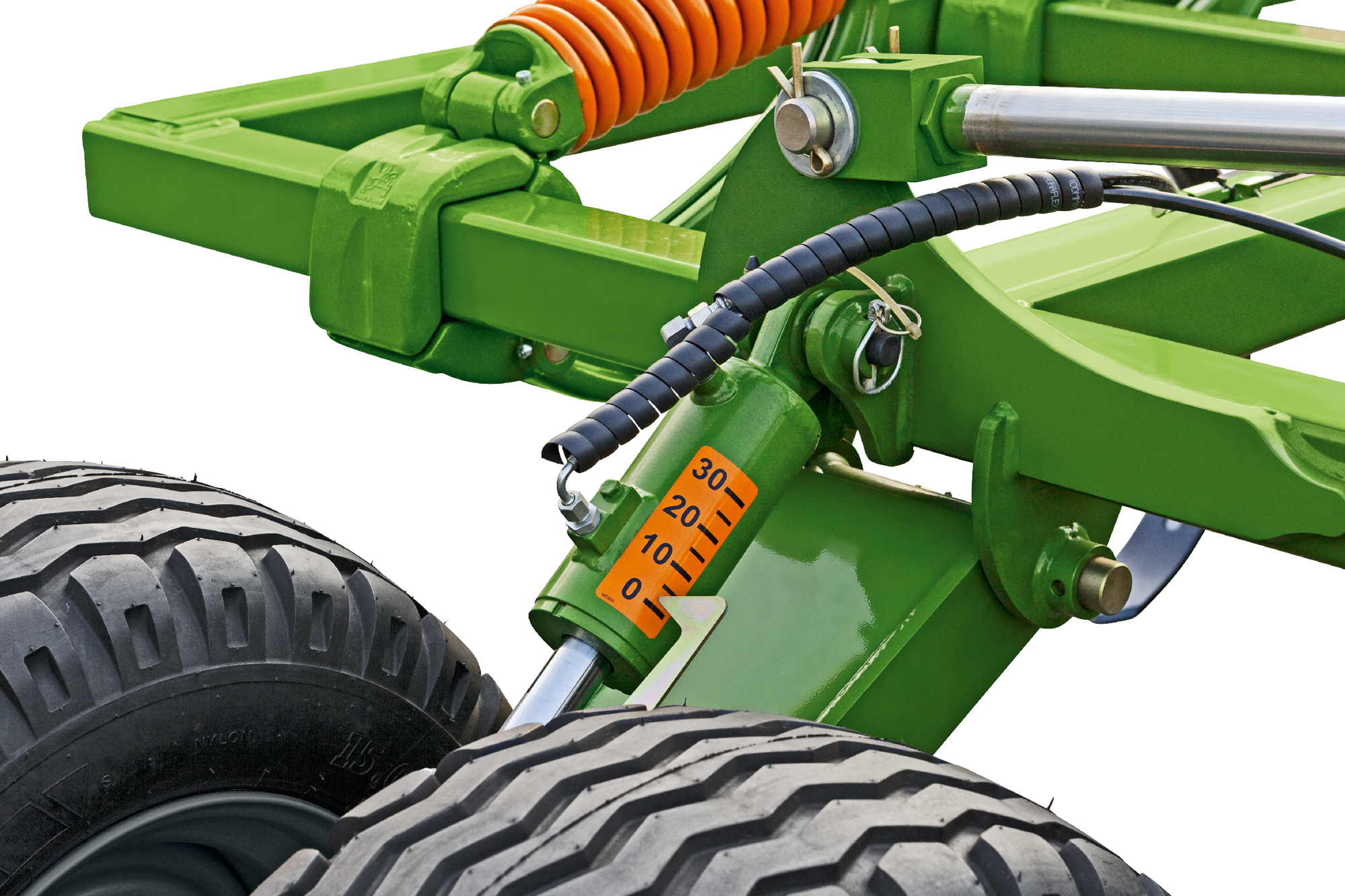 Die Arbeitstiefe der Einebnungseinheit wird bei allen Cenius schnell, sicher und werkzeuglos über 2 Spindeln eingestellt. Um die Arbeitsqualität und den Bedienkomfort zu verbessern, bietet AMAZONE zusätzlich eine hydraulische Einstellung der Einebnungseinheiten an. Damit ist die komplette Einstellung aus der Traktorkabine möglich. Die hydraulische Einstellung bietet ein Maximum an Komfort und Arbeitssicherheit. Über eine vom Fahrersitz sehr gut einsehbare, deutliche Skala ist die aktuelle Arbeitsstellung der Einebnungselemente ablesbar, sodass einfach und schnell reagiert werden kann.