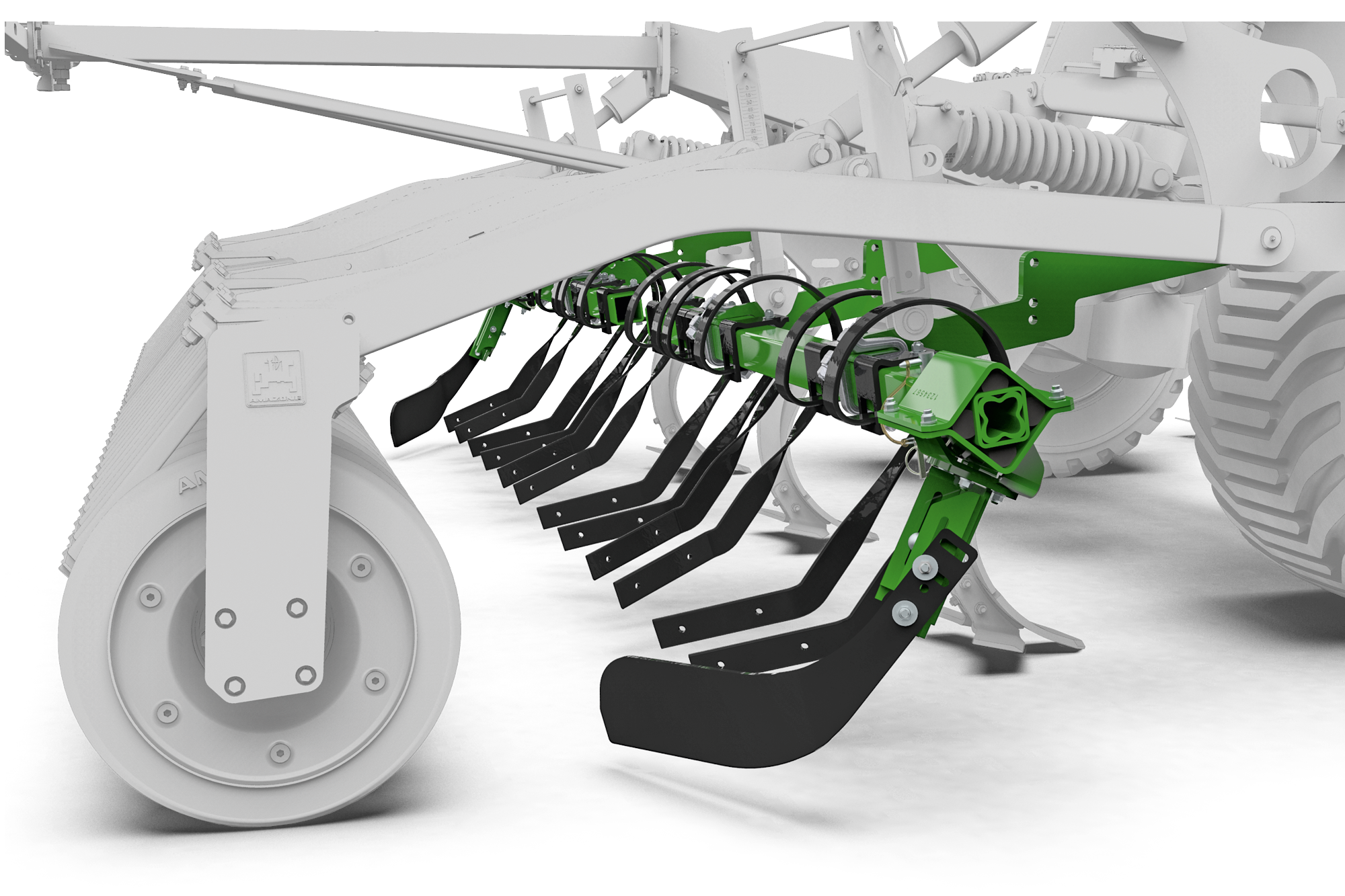 Die Position der Scheibenreihen bzw. Federstahlzustreicher zur Krümelung und Einebnung wird über Einstellspindeln zentral und ebenfalls werkzeuglos eingestellt. Einstellbare Randelemente ermöglichen saubere Anschlussfahrten.