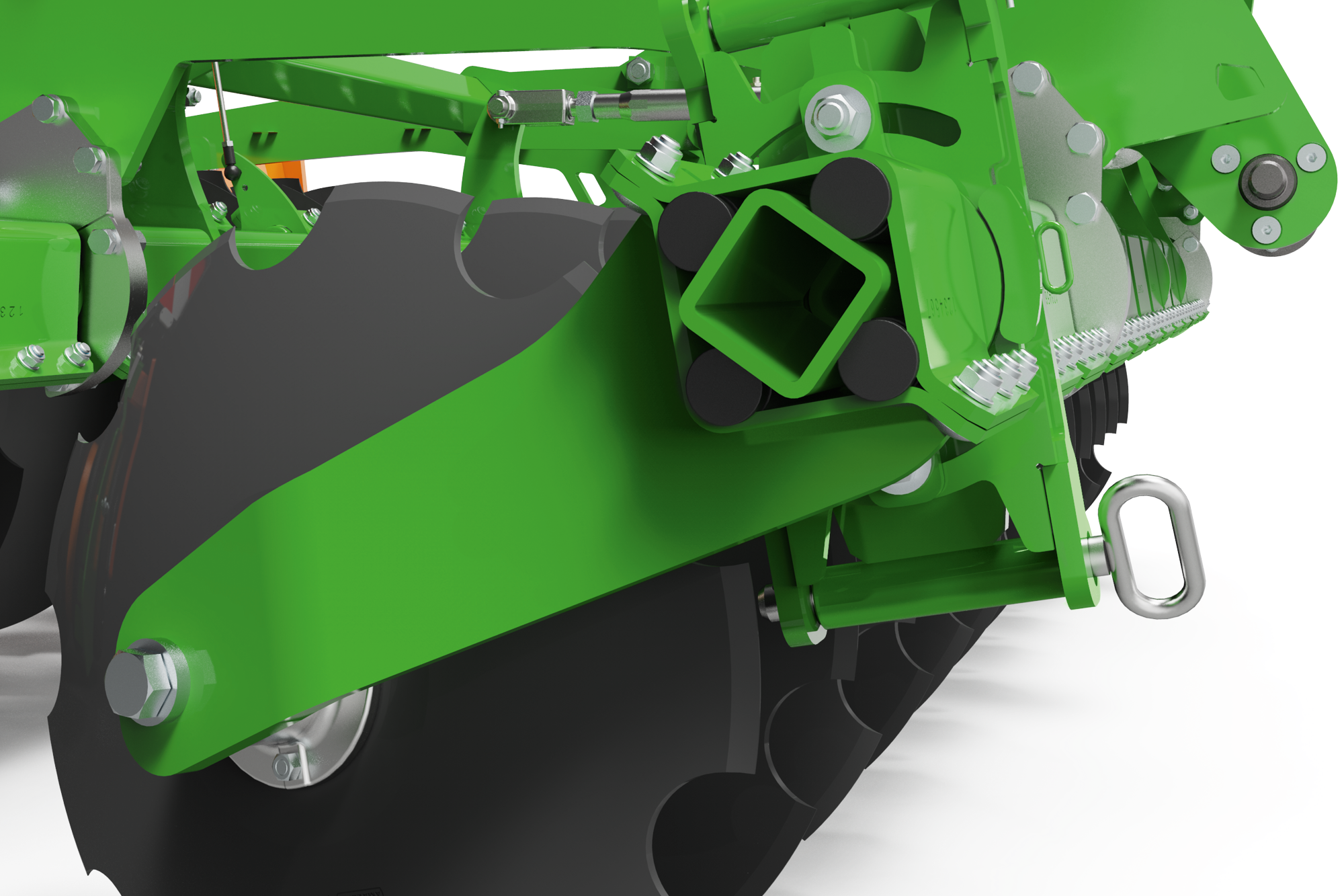 Die elastischen Gummifederelemente an jeder Scheibenaufhängung dienen nicht nur der optimalen Anpassung an die Kontur der Bodenoberfläche, sondern auch als Überlastsicherung für die einzelnen Scheiben. Die groß dimensionierten Gummifedern sind wartungsfrei und zeichnen sich durch einen großen Federweg aus, der Ihnen Sicherheit auch bei großen Steinen bietet.