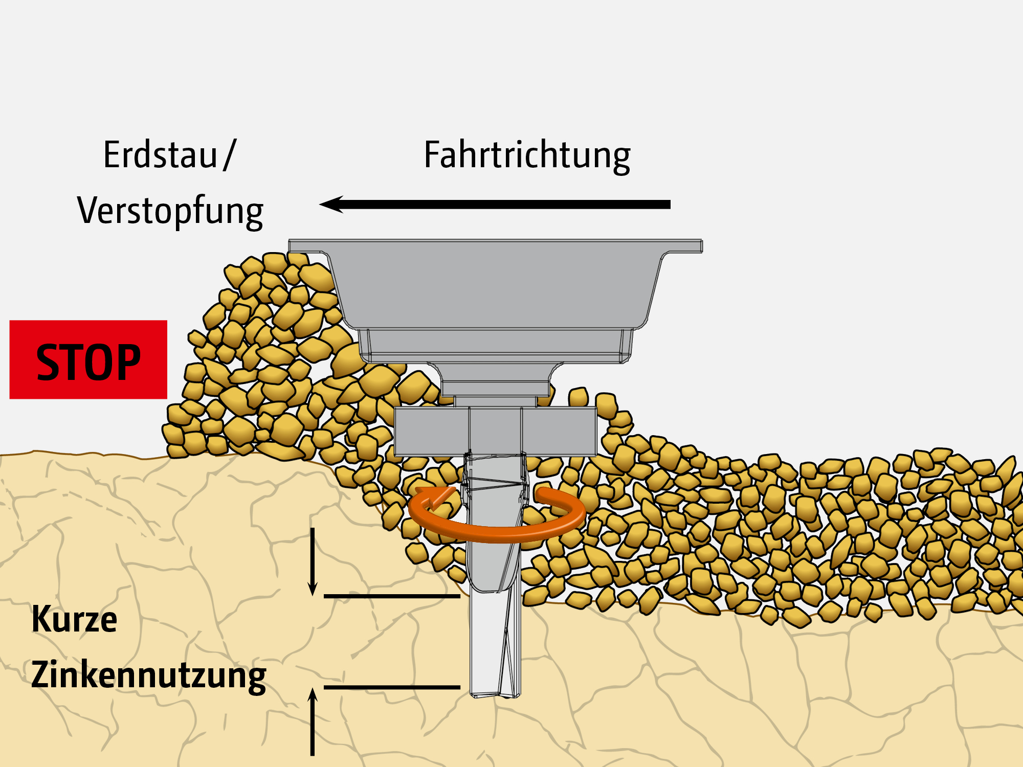 Die federnde Zinkenbefestigung ermöglicht ein Ausweichen des Zinkens an Steinen. Die Zinken sind in der Werkzeugträgermitte in der Tasche fest eingespannt. Diese Tasche erweitert sich dann nach außen hin, sodass sich der waagerechte Teil des Zinkens federnd verdrehen kann. Beim Auftreffen der Zinkenspitze auf Steine werden damit harte Stöße gedämpft. Diese Zinkenbefestigung gibt Sicherheit auf steinigen Böden und erlaubt bei der KX und dem KG die Stellung „Zinken auf Griff“.