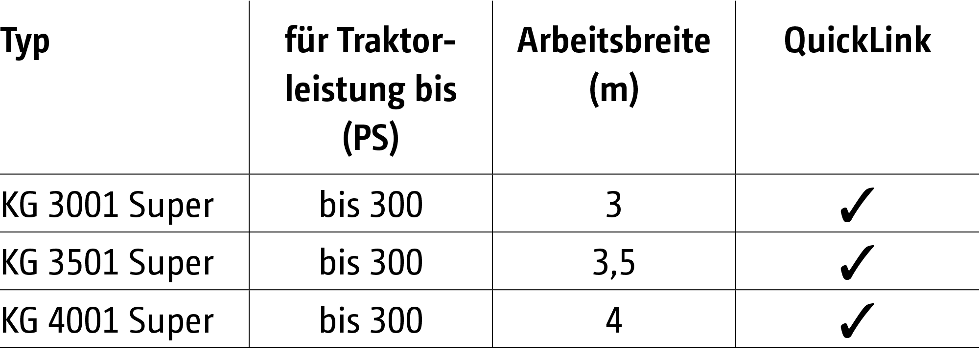 Die Kreiselgrubber KG Super mit 3 m, 3,5 m und 4 m Arbeitsbreite sind mit einem leistungsstarken Getriebe für Traktorleistungen bis 300 PS ausgestattet. Der KG Super hat serienmäßig verstärkte Zinken und kann optional mit hydraulischer Tiefenverstellung und Ölkühler bestellt werden.