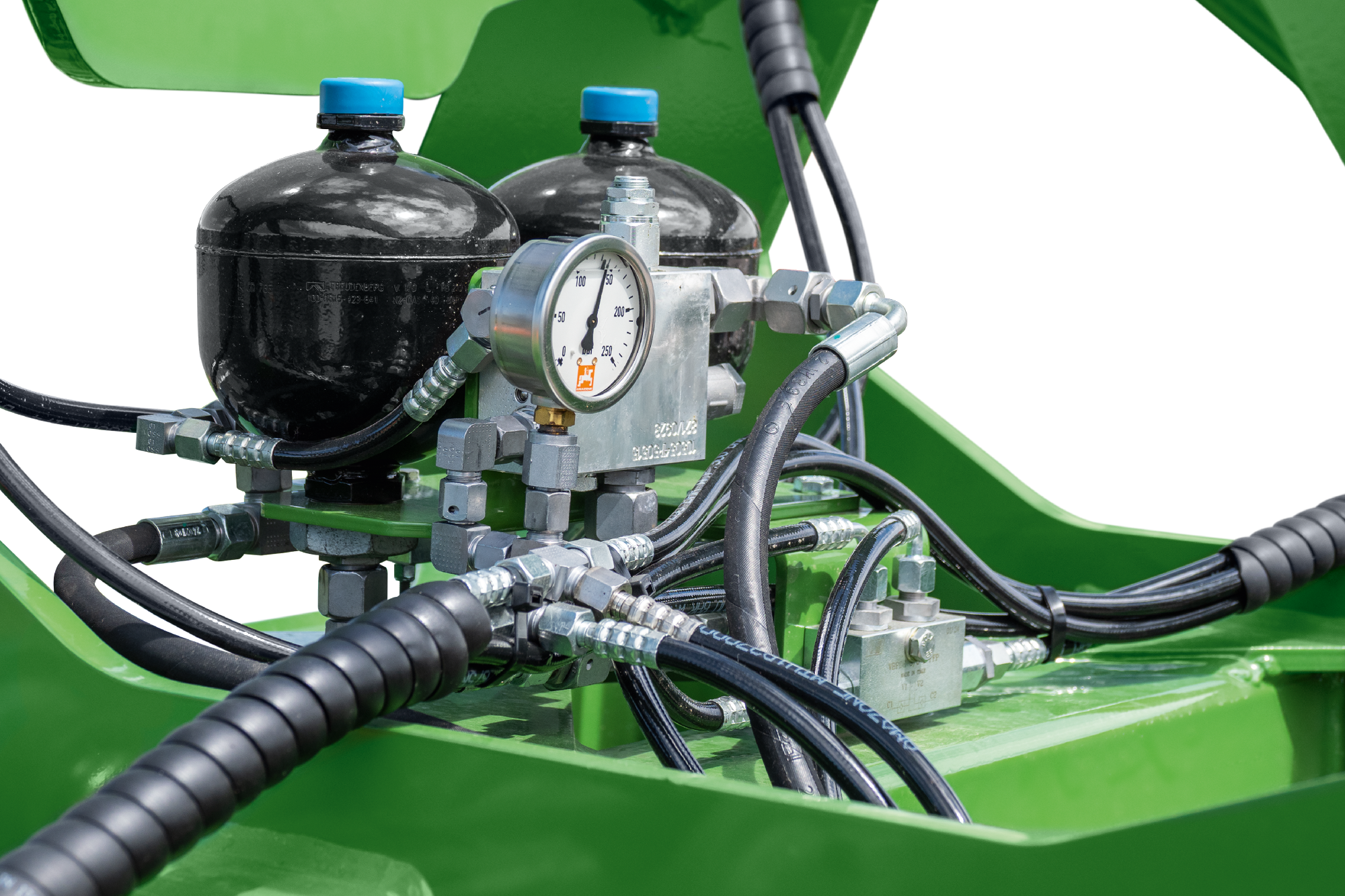 Die 2 Seitenrahmen des TopCuts werden für eine bessere Anpassung an den Boden mit dem System ContourFrame hydraulisch vorgespannt. So wird die optimale Anpassung an die Kontur eines hügeligen Geländes ermöglicht.