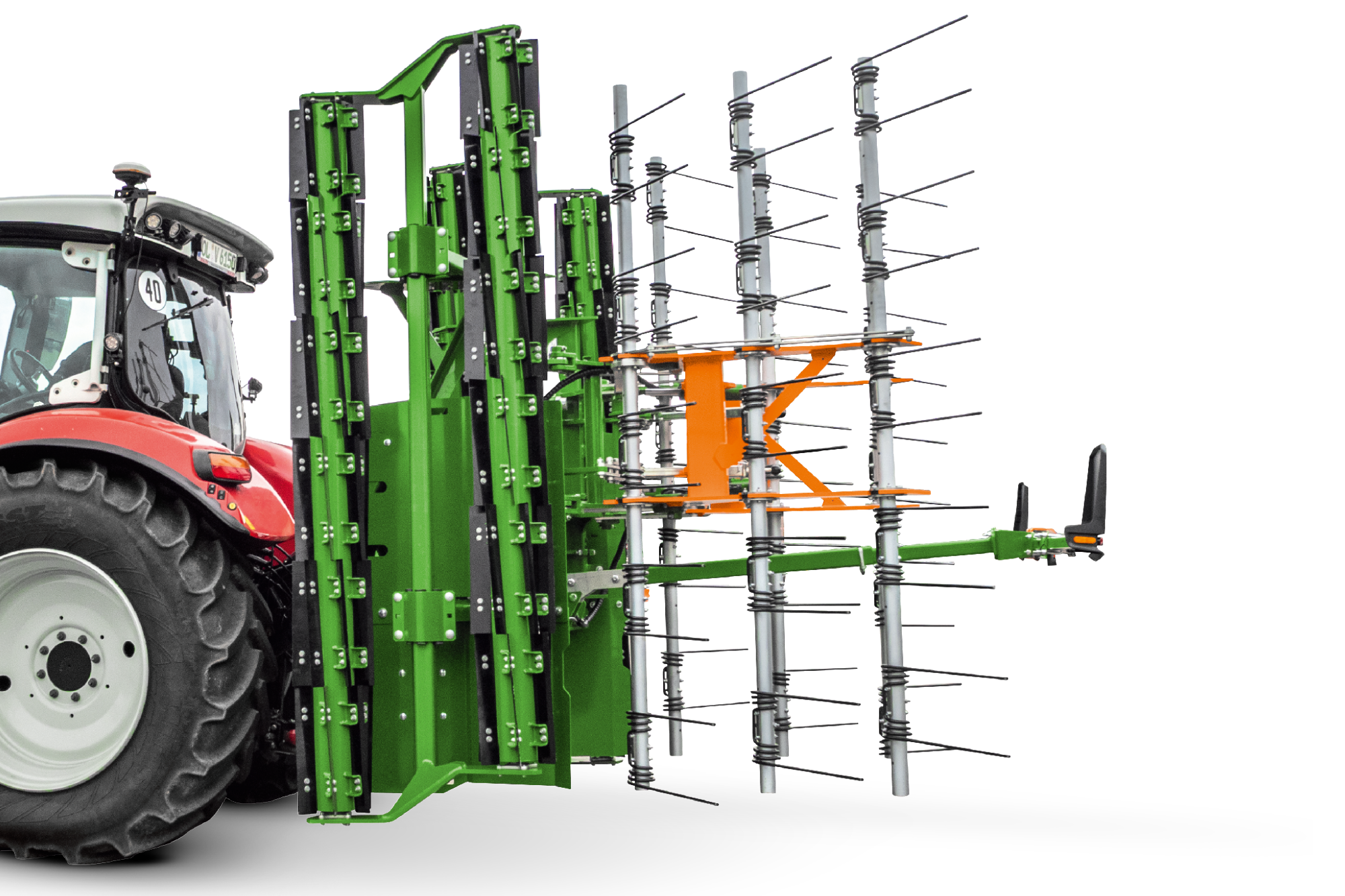 Die zweiteilige Klappung ermöglicht einen schnellen Wechsel zwischen den Feldern. Für den Straßentransport sind Verkehrssicherungsleisten an den Striegelzinken anzubringen.