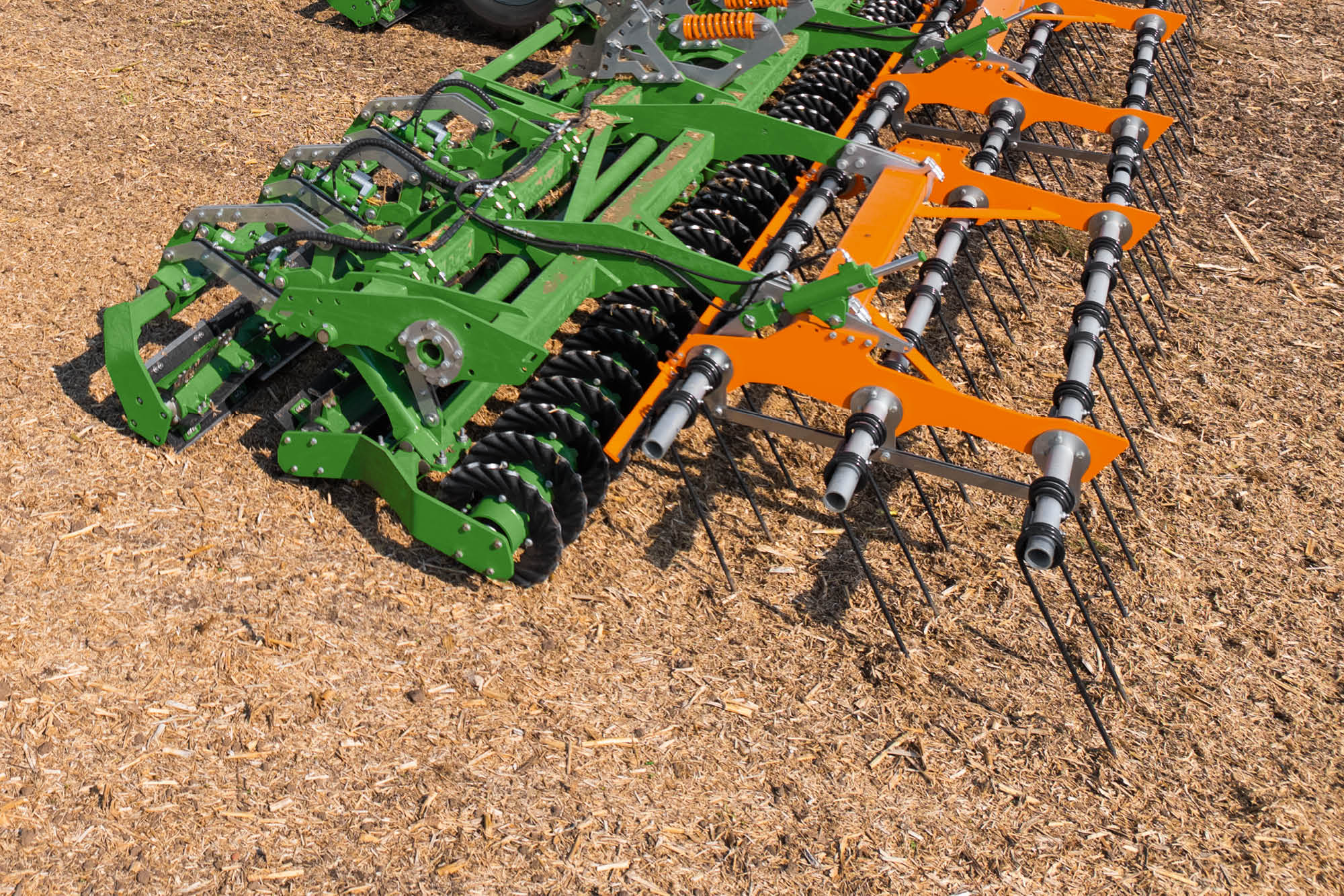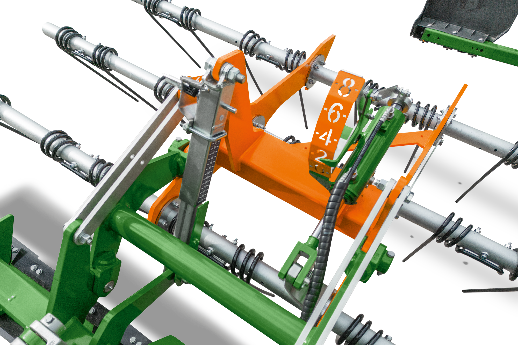 Auch bei der angehängten Maschine erfolgt die Neigungsverstellung des Striegels vollhydraulisch aus der Traktorkabine.