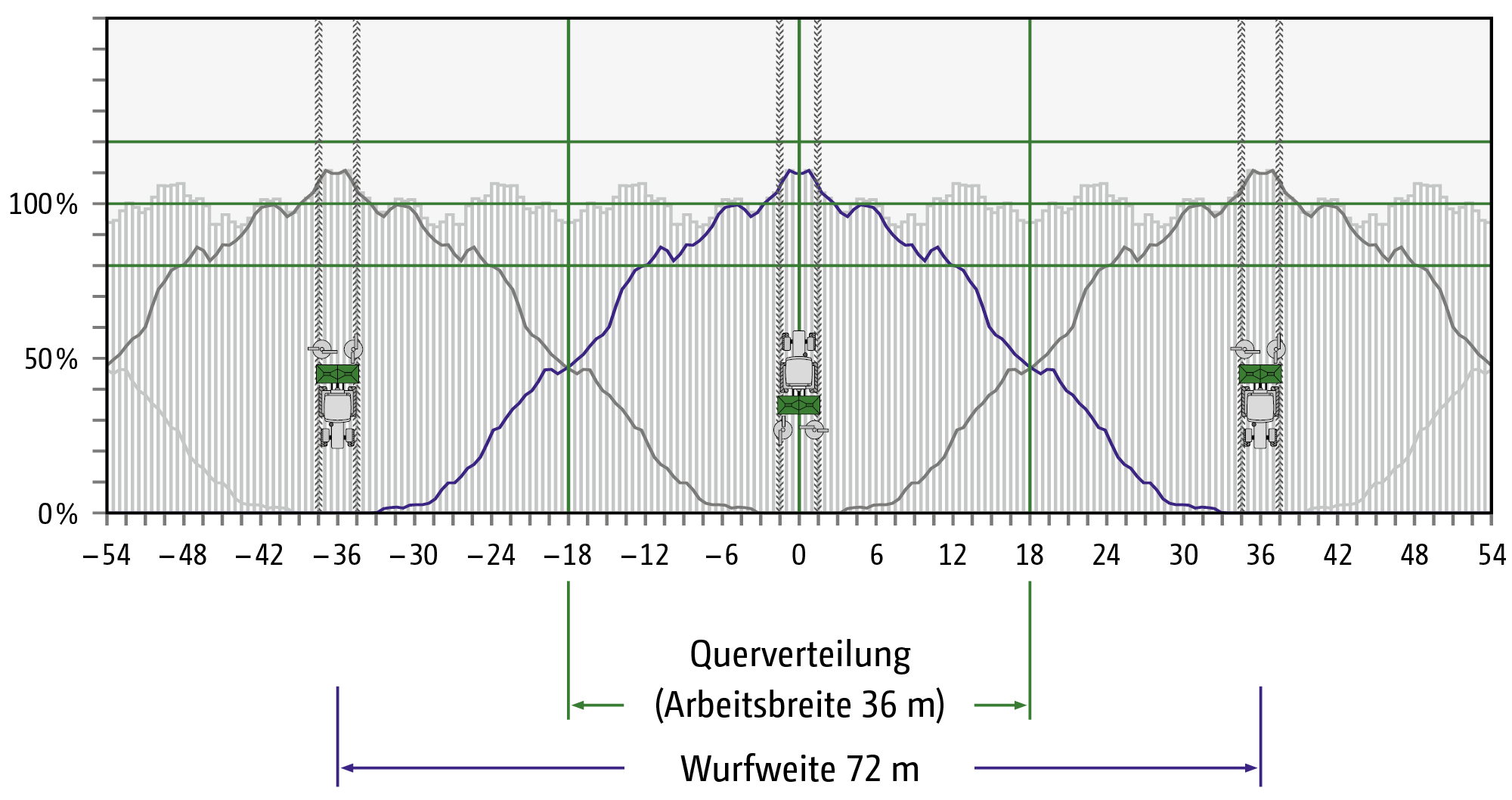 Das Streuwerk des ZA-V wurde mit dreidimensionalen Streubildern entwickelt, damit eine perfekte Querverteilung entsteht. Dank Soft Ballistic System können Arbeitsbreiten von bis zu 36 m generiert werden. Die großen Überlappungszonen sorgen für ein perfektes Streubild.