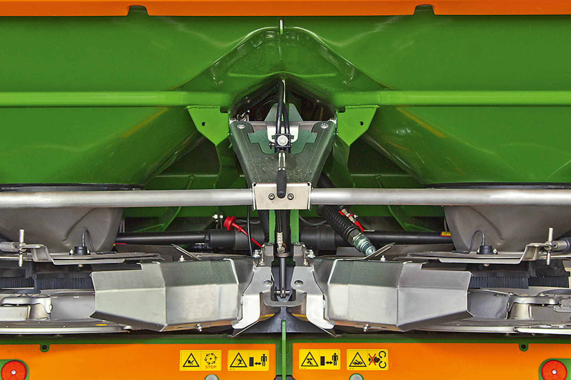 Hierbei sind LED-Arbeitsscheinwerfer im Behälter, oberhalb der Streuscheiben und an den Seiten des Streuers verbaut. Somit ist auch bei Dunkelheit gewährleistet, dass der Anwender einen Überblick hat über den Füllstand im Behälter und ausreichend Licht für den Streuscheibenwechsel sowie für das Einstellen der Teleskope an den Streuschaufeln.