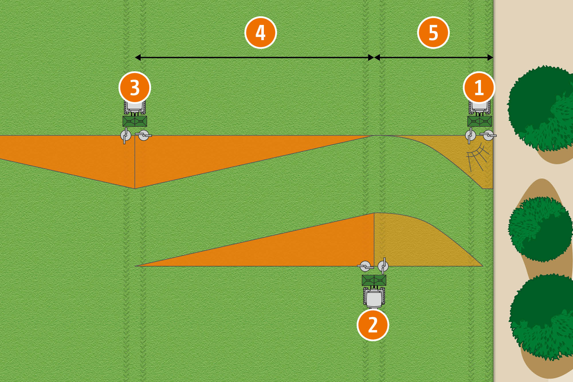 - Düngerausbringung mit dem BorderTS-Schirm von der Feldgrenze aus in den Bestand hinein mit automatischer Reduzierung der Sollmenge auf 50 %. Die zur Feldgrenze gewandte Dosieröffnung ist geschlossen.