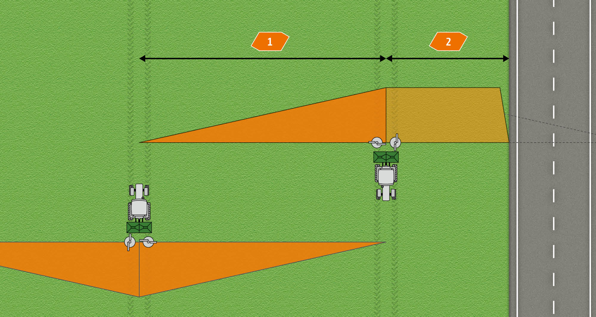 Der angrenzende Schlag ist eine landwirtschaftlich genutzte Fläche. Hier kann es toleriert werden, dass eine geringe Menge des Düngers über die Feldgrenze geworfen wird. Die volle Sollmenge wird bis an die Feldgrenze ausgebracht.