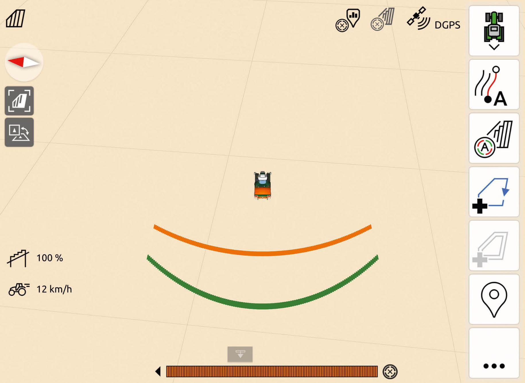 Der angrenzende Schlag ist eine landwirtschaftlich genutzte Fläche. Hier kann es toleriert werden, dass eine geringe Menge des Düngers über die Feldgrenze geworfen wird. Die volle Sollmenge wird bis an die Feldgrenze ausgebracht.
