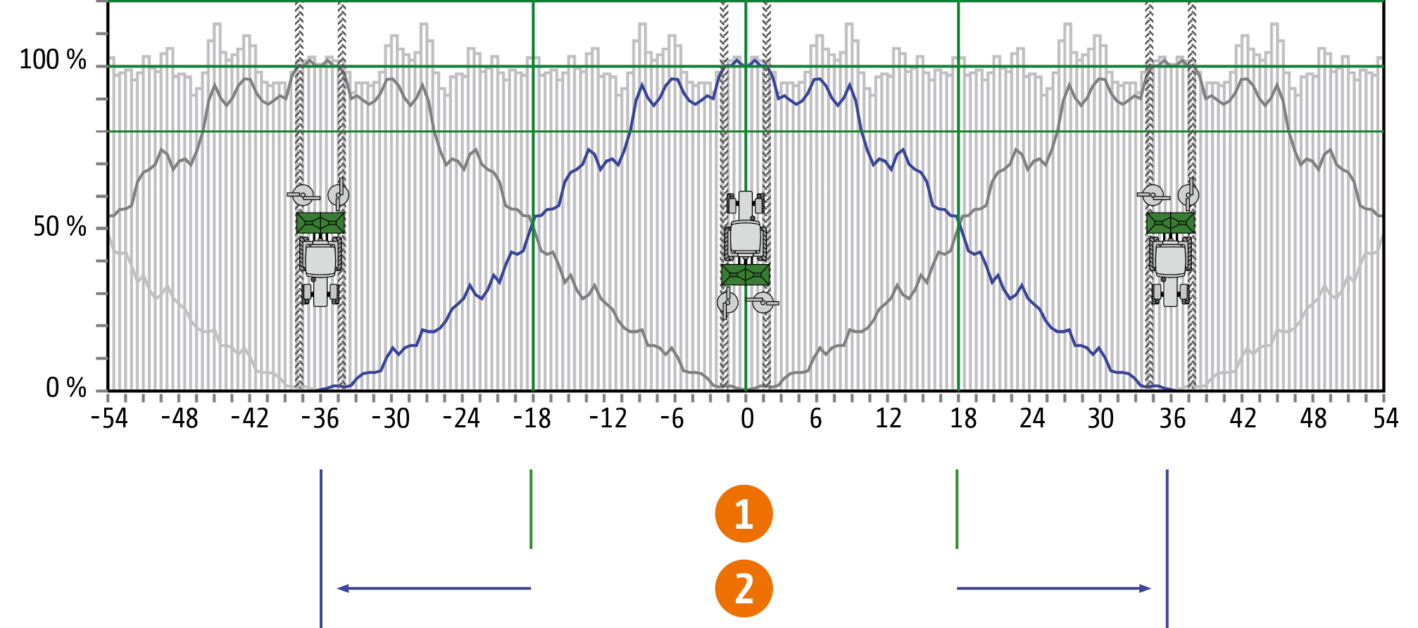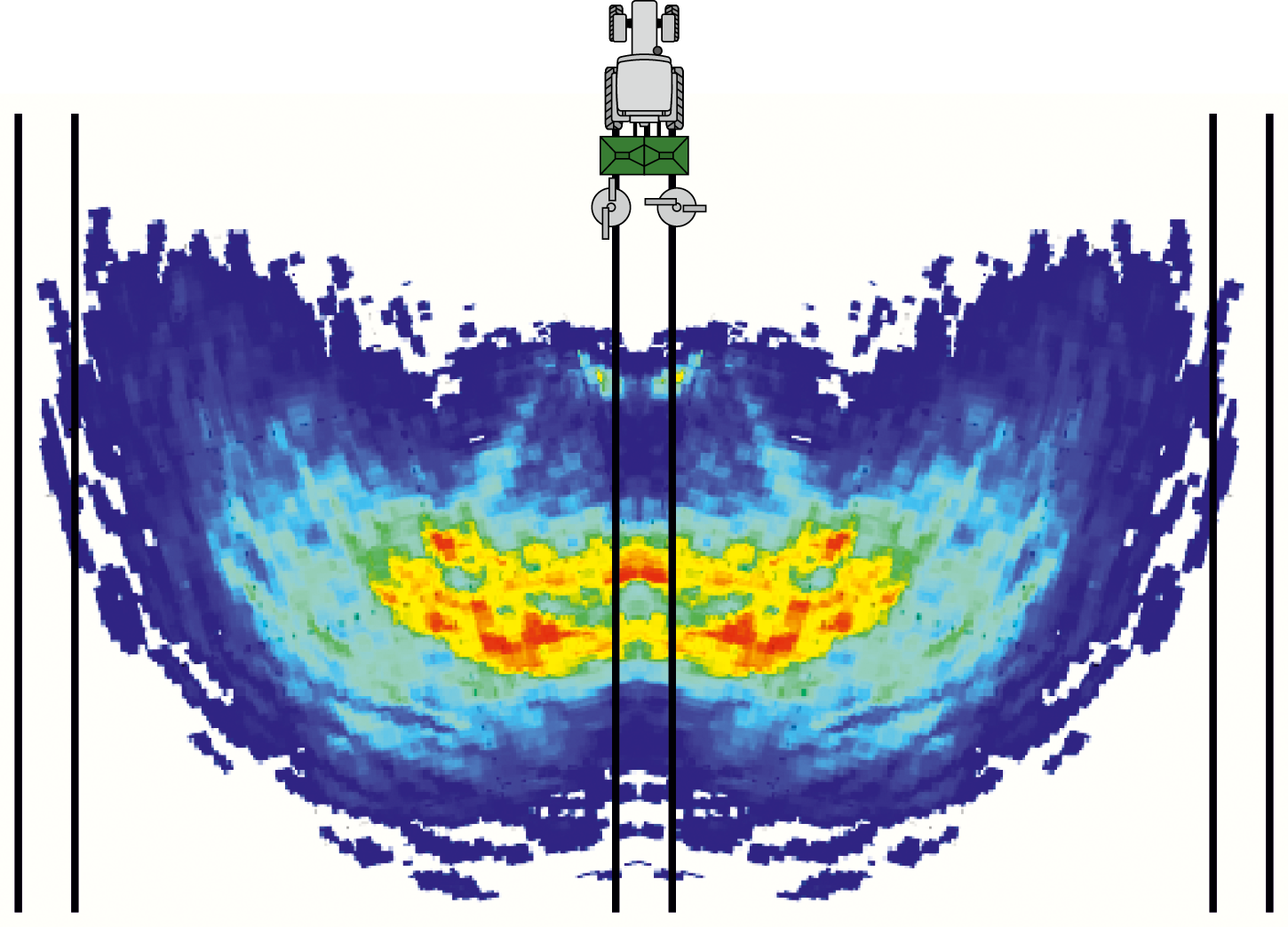 Das Streuwerk wurde mit dreidimensionalen Streubildern entwickelt, damit eine perfekte Querverteilung bis zu 54 m Arbeitsbreite entsteht. Die großen Überlappungszonen sorgen für ein perfektes Streubild und sind deutlich stabiler gegenüber sämtlichen äußeren Einflüssen wie Seitenwind, Hangneigung, Luftfeuchtigkeit und wechselnde Düngerqualität.