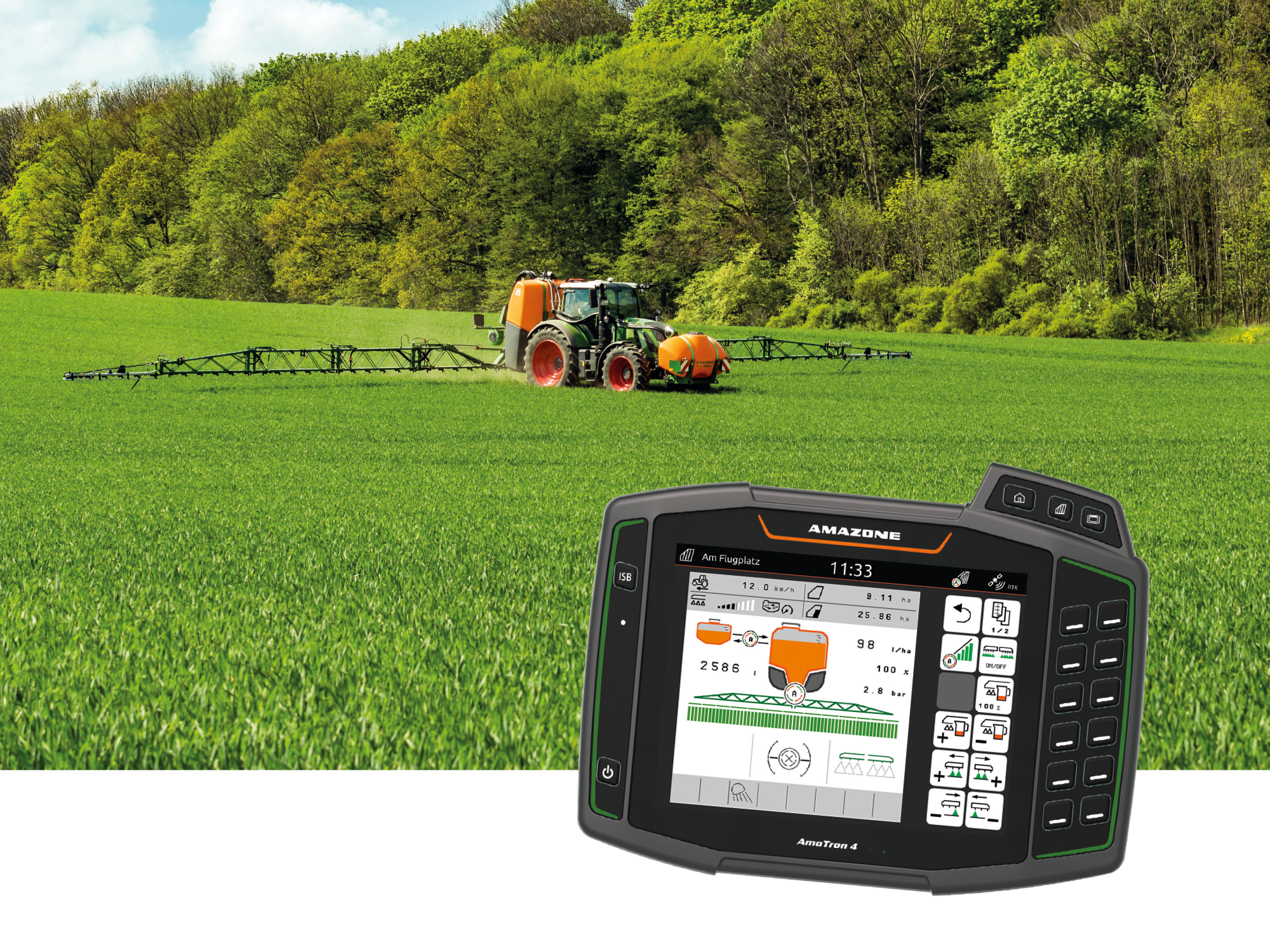Das ISOBUS-Terminal steuert automatisch den Flüssigkeitskreislauf, so dass immer eine optimale Gewichtsverteilung herrscht. Eine zu frühe Entlastung der Vorderachse wird verhindert. Abhängig vom Füllstand wird aus dem Fronttank rechtzeitig neue Spritzflüssigkeit gefördert, damit die Anbauspritze niemals vor dem Fronttank leer wird. Die Spritzflüssigkeit bleibt dabei immer homogen.