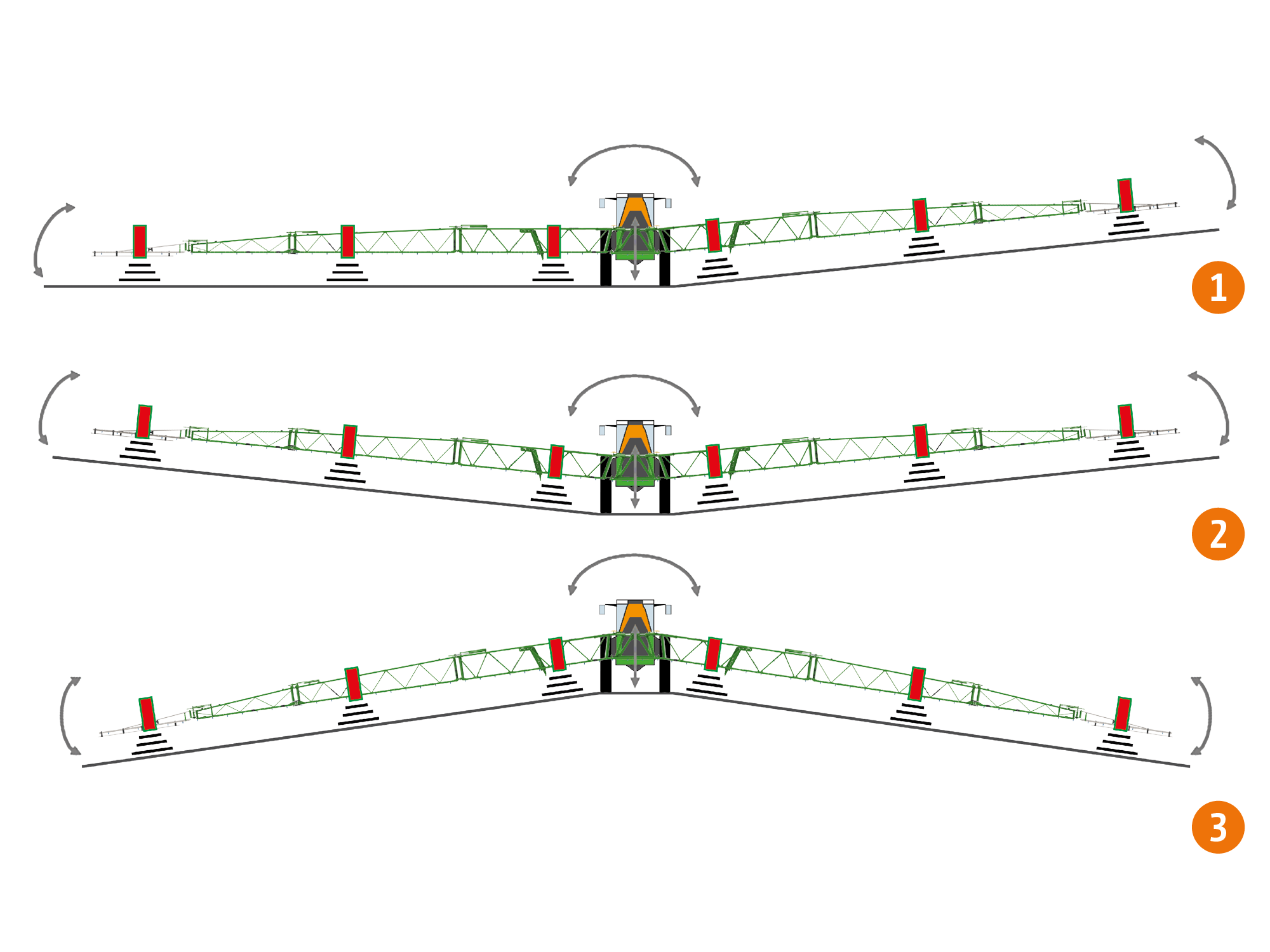 Die massiven Ausleger mit den hydraulisch vorgespannten Ausweichgelenken in den Endauslegern sorgen für eine absolut ruhige Gestängelage unter allen Bedingungen. Sollten trotz der massiven Bauweise Schwingungen durch Kurvenfahrten oder Beschleunigungsvorgänge auftreten, werden diese direkt durch SwingStop plus reduziert.