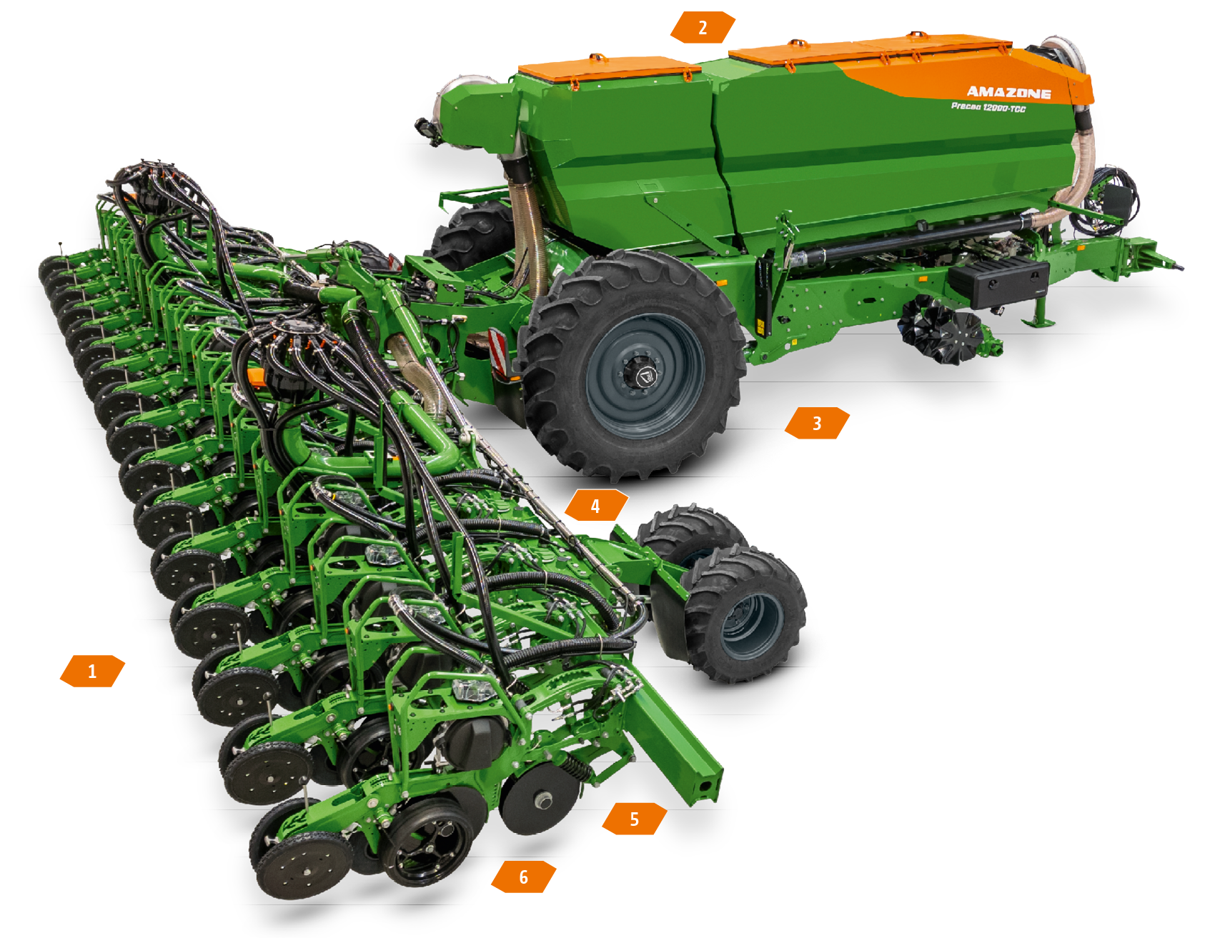 2. Das große Behältervolumen für Saatgut und Dünger, gepaart mit der großen Arbeitsbreite, steht für hohe Schlagkraft und geringe Nebenzeiten für Befüllen und Transportfahrten.