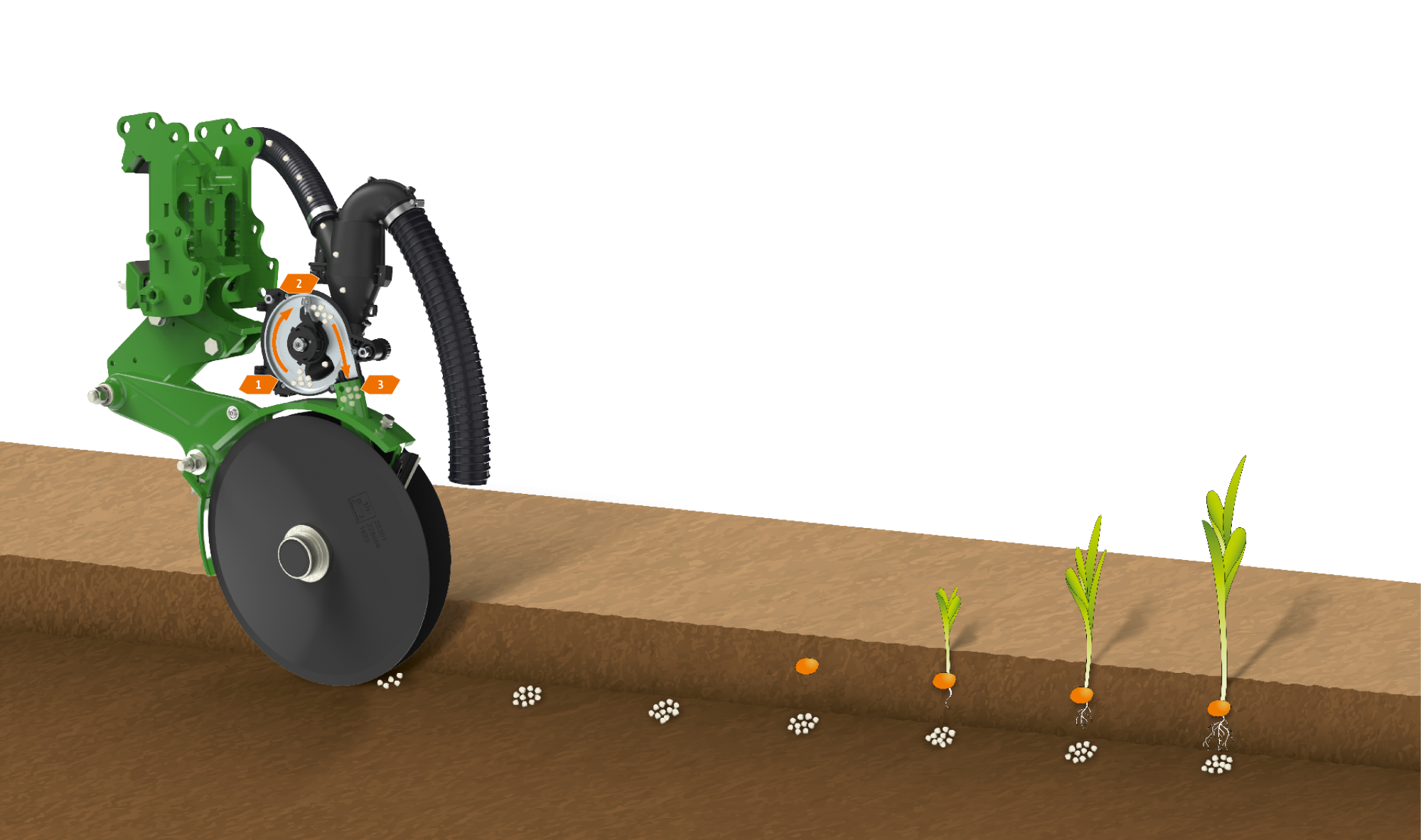 3. Die Düngerportion wird über den Auslass der Portionierkammer über die Schussstrecke exakt in den Boden platziert, synchron zu der Ablage des Saatgutkorns.