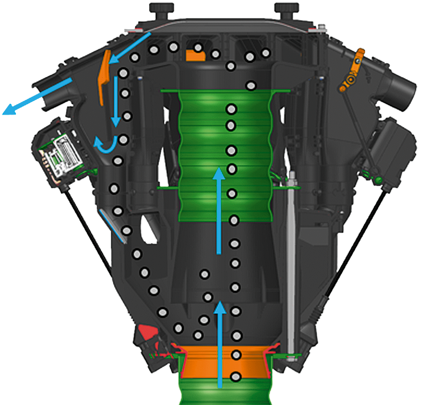 Per Dosierwalze in der Gebereinheit wird der Dünger per Luftstrom vom zentralen Behälter in den Verteilerkopf transportiert. Von hier erfolgt der Transport zu dem einzelnen FerTeC twin HD-Düngerschar, um schließlich als Unterfußdüngung im Düngerband in den Boden eingebracht zu werden.