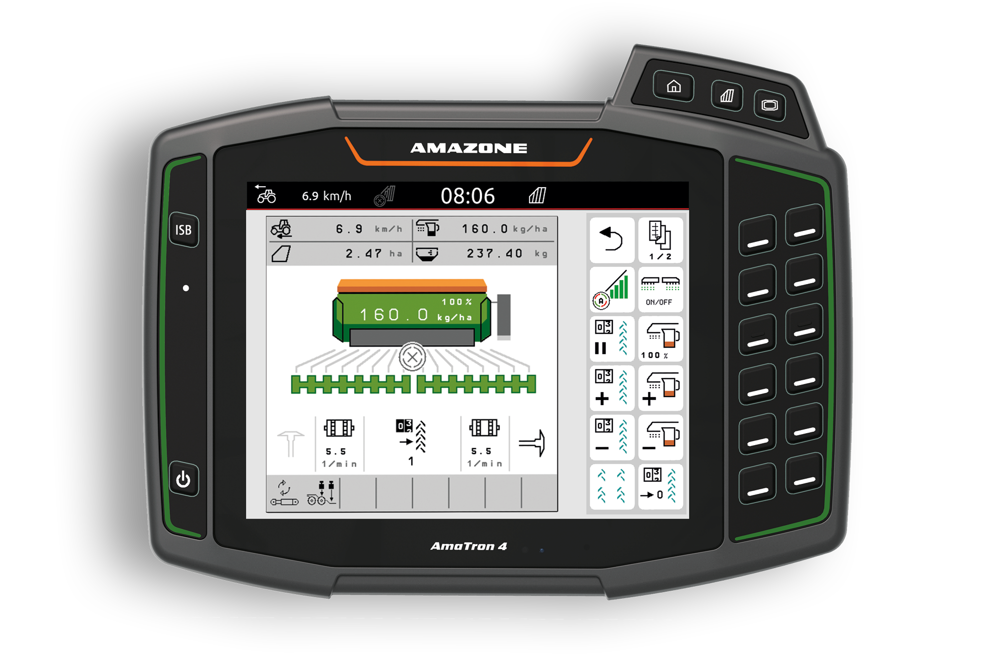 Das von AMAZONE selbstentwickelte ISOBUS-Bedienterminal AmaTron 4 erlaubt die komfortable Steuerung einer jeden ISOBUS-fähigen Landmaschine mit Touch-Bedienung. Das AmaTron 4 ermöglicht dabei alle ISOBUS-Funktionen – mit einem Mehr an Komfort, Bedienerfreundlichkeit und Übersicht. Und doch: Es leistet insbesondere im Zusammenspiel mit AMAZONE Landmaschinen noch mehr und garantiert volle Funktionalität der Präzisionslandwirtschaft.