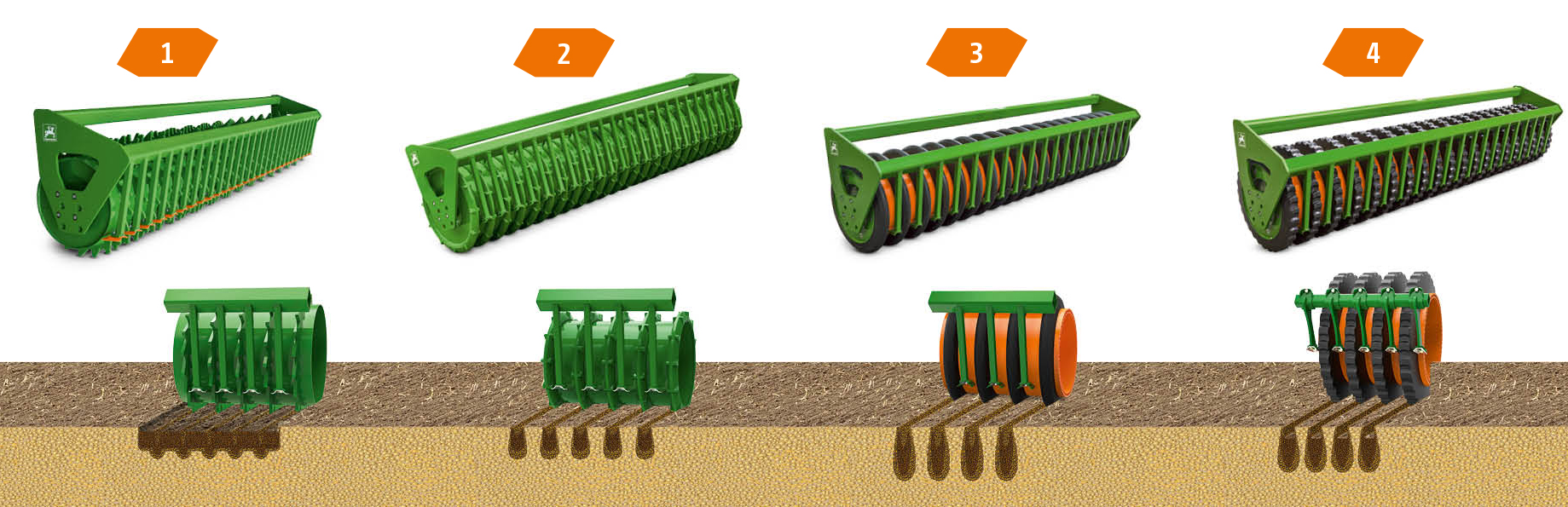 Für die Wahl der Walze stehen diverse Typen zur Verfügung, sodass die komplette Einheit der Bodenbearbeitung perfekt auf die jeweiligen Standortverhältnisse angepasst werden kann.