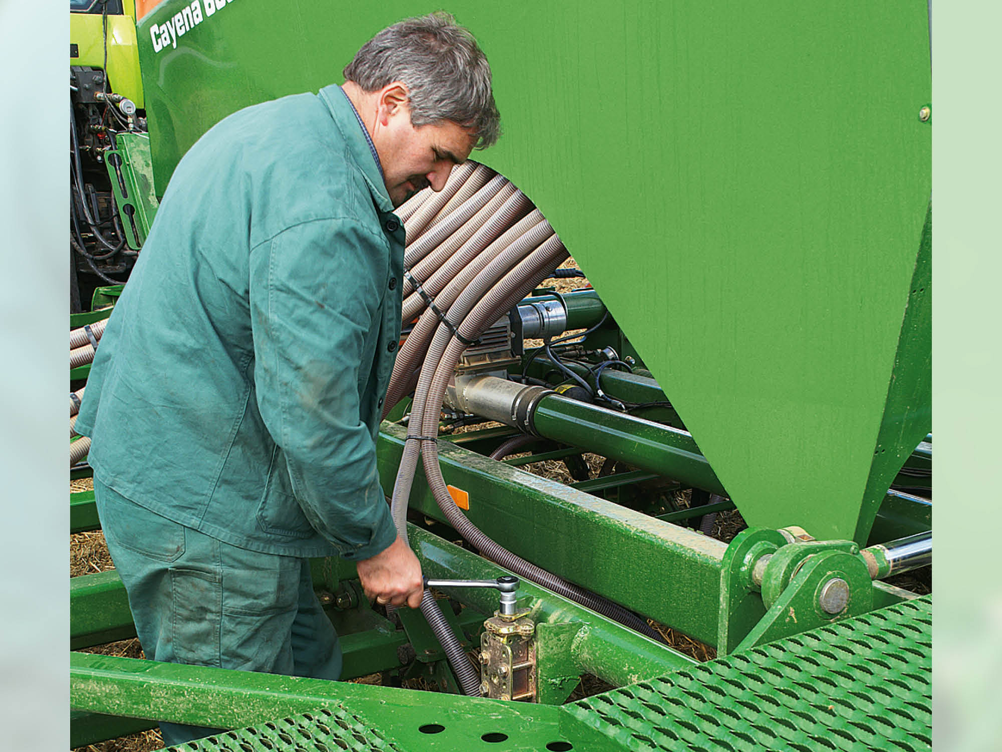 Die Cayena wird über die Unterlenker des Traktors und die Keilringreifen getragen. Vor den Zinkenfeldern laufende Tasträder (optional) sorgen für Laufruhe auch bei hohen Sägeschwindigkeiten.