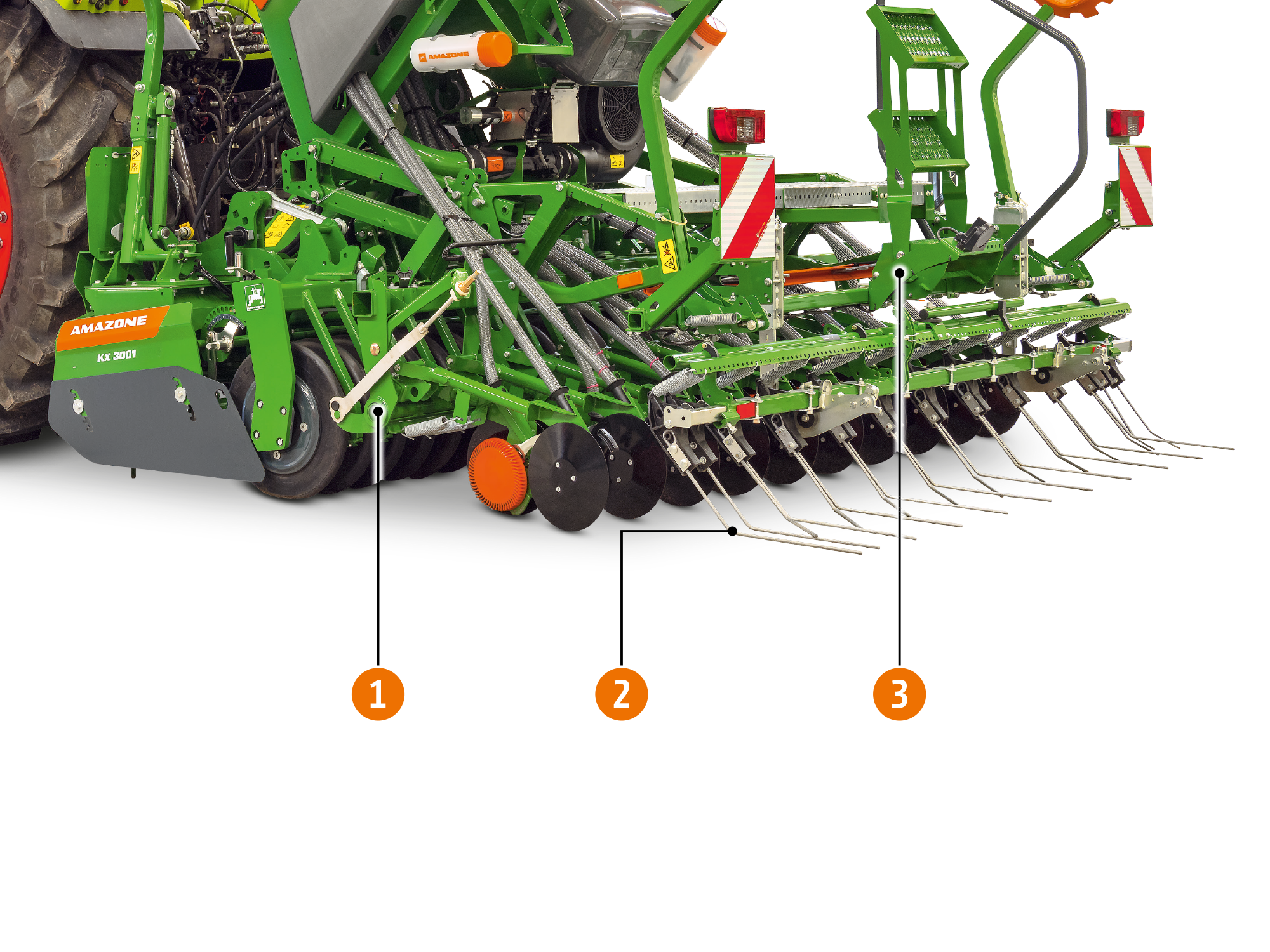 Die 3-reihige Anordnung und der große Scharschritt geben Sicherheit gegen Verstopfungen im Scharbereich. Ein Führungstrichter im Schar leitet die Saat exakt bis hinter die Scharspitze. Die Scharstütze verhindert das Verstopfen des Scharauslaufes beim Absetzen der Maschine.
