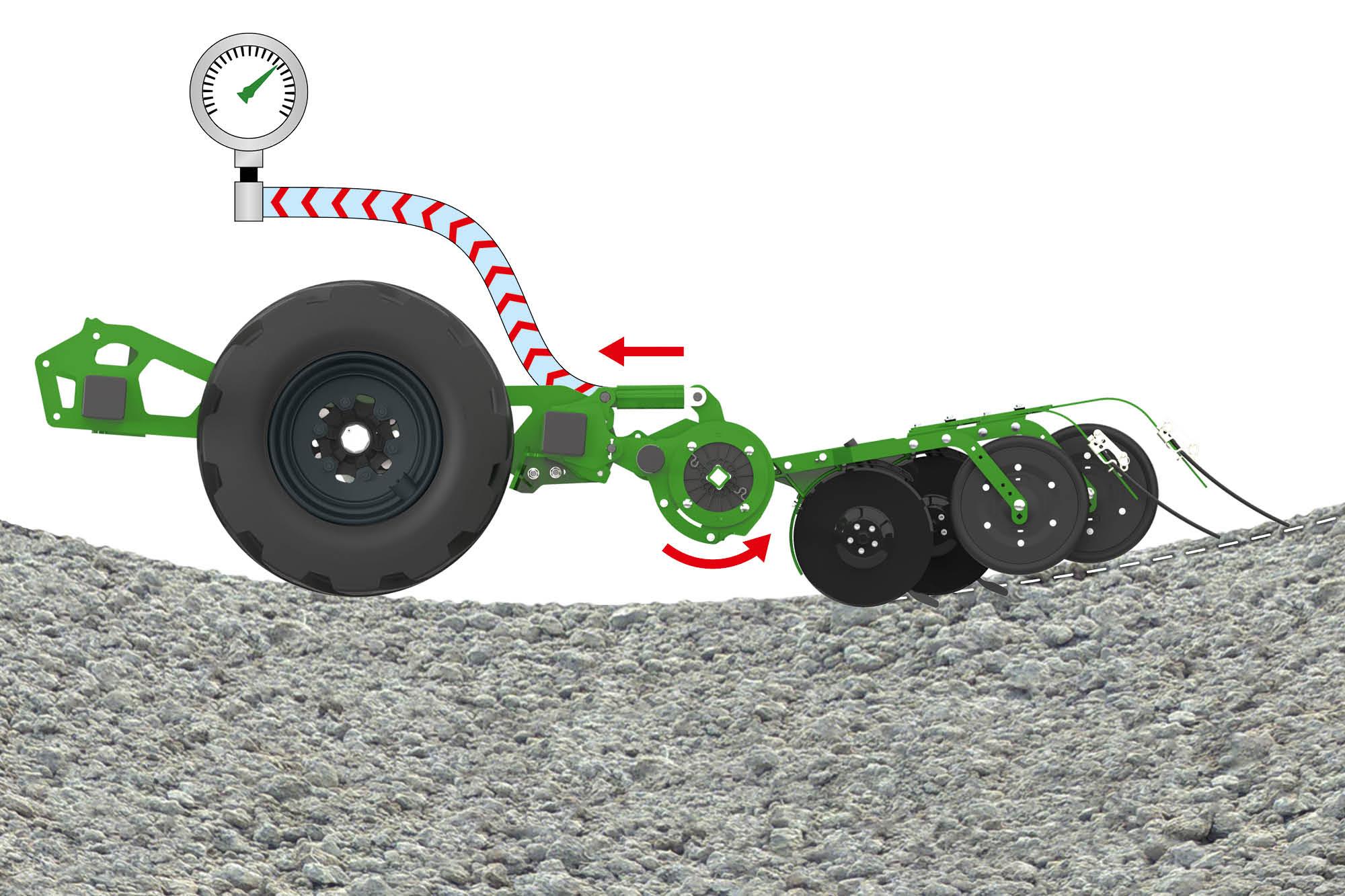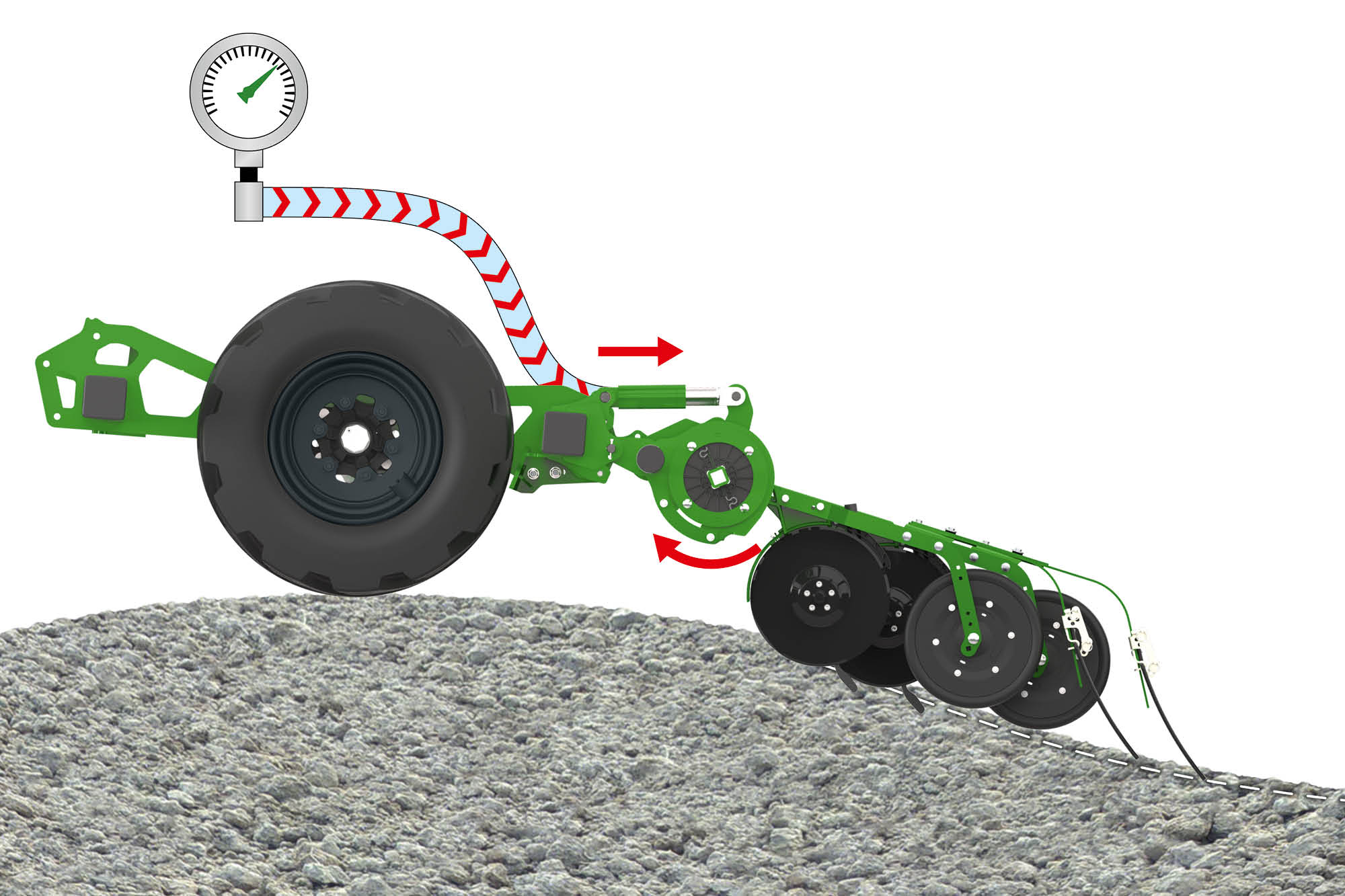 Zusätzlich zur immer optimalen Saattiefe bietet die automatische Schardruckregelung eine große Arbeitserleichterung für den Fahrer. Vor allem bei Nachtschichten oder für Arbeitskräfte, die gewöhnlich andere Arbeiten erledigen, ist dies eine große Hilfe und sorgt für eine gleichbleibende Arbeitsqualität.