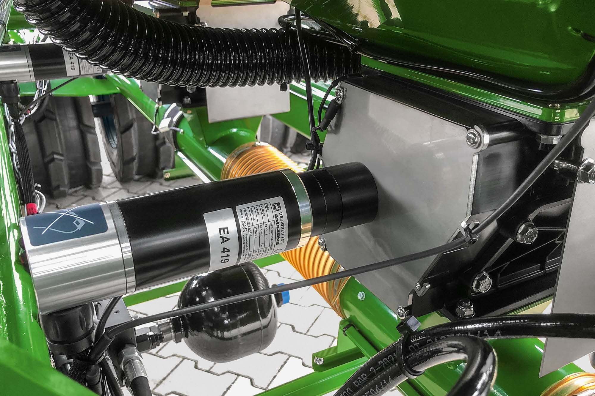 Der Verteilerkopf transportiert die Ausbringgüter zuverlässig an die einzelnen Zinkenschare. Über eine optionale Saatleitungsüberwachung können Blockaden am Zinkenschar oder in den Saatleitungen erkannt werden.