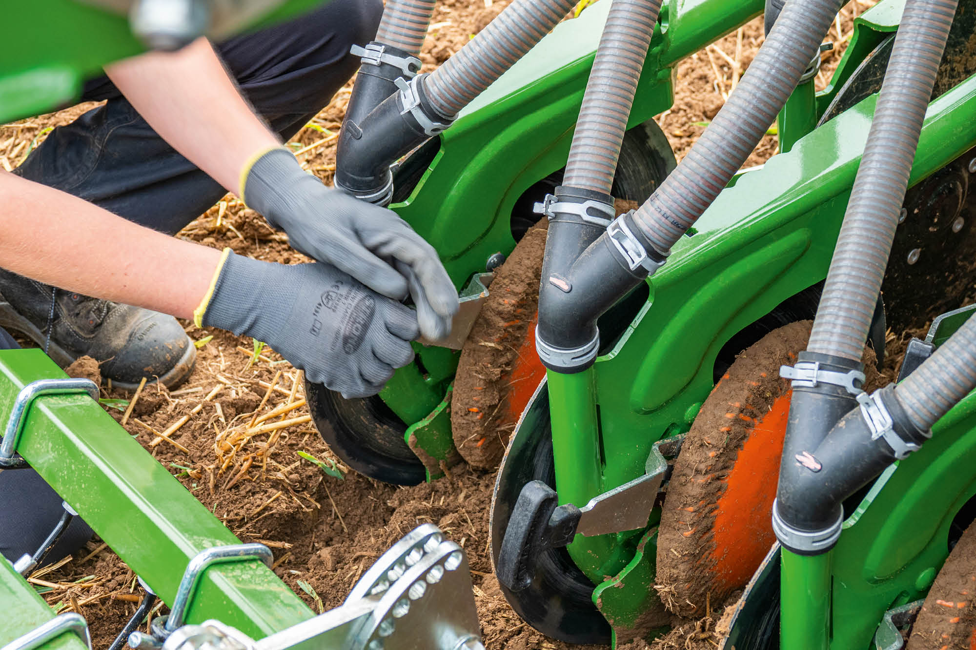 - Breitflächige Ausbringung über Prallteller, über Särohre zwischen den Scharen oder über einen zweiten Auslauf am TwinTeC plus-Schar