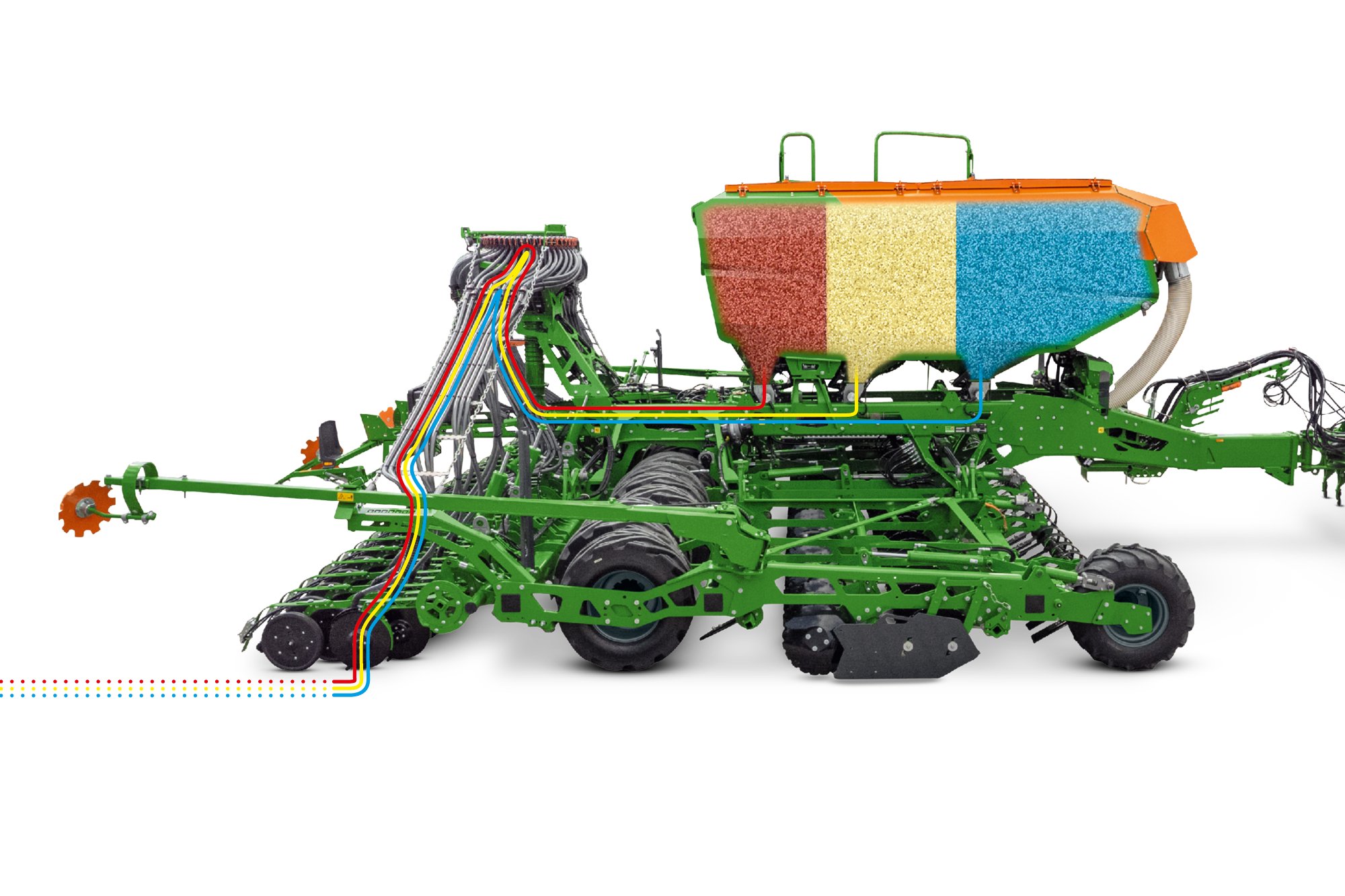 • Mehrkammerbehälter mit bis zu 3 Kammern für verschiedene Saatgüter und Dünger