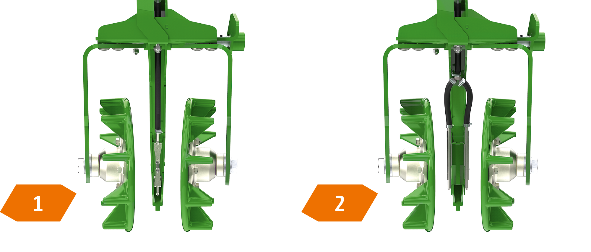 Der Flüssigdünger wird über Schläuche zu den Scharen der Sämaschine gepumpt. Die Düngerschläuche sind sauber verlegt und mit einem Schutzmantel gegen Steinschläge und Beschädigungen geschützt. Der Flüssigdünger wird über einen speziellen Auslauf am Säschar abgegeben, entweder direkt in die Säfurche (1) oder über einen Doppelauslass links und rechts seitlich der Säfurche (2). Um ein Nachtropfen am Vorgewende zu verhindern, verfügt jeder Auslauf über eine eigene Tropfstoppmembran. Zudem verfügt jeder Auslauf, je nach Ausbringmenge, über eine entsprechend große Dosierscheibe.
