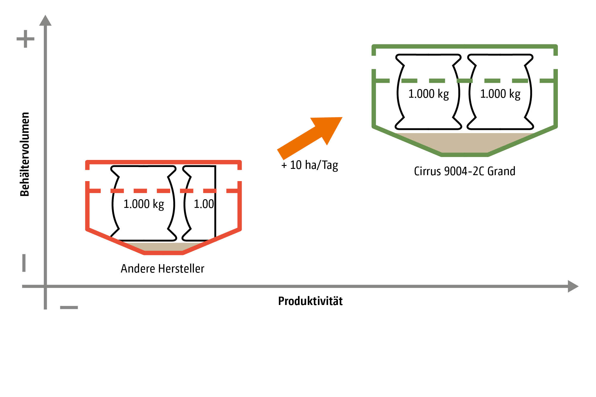 Standardmäßig ist die Cirrus 9004-2C Grand mit einem Zweikammerbehälter ausgestattet, der im Verhältnis 60:40 geteilt ist. Das für Bigbag optimierte und mit einer ausreichenden Überkapazität bemessene Gesamtvolumen des Behälters liegt bei 5.750 l. Durch die Überkapazität kann dann befüllt werden, wenn es gerade passt. Der Behälter kann immer den kompletten Inhalt eines Bigbags aufnehmen, auch bei einer größeren Restmenge. Das vereinfacht die Saatgutlogistik, da der Zeitpunkt der Befüllung flexibler werden kann.