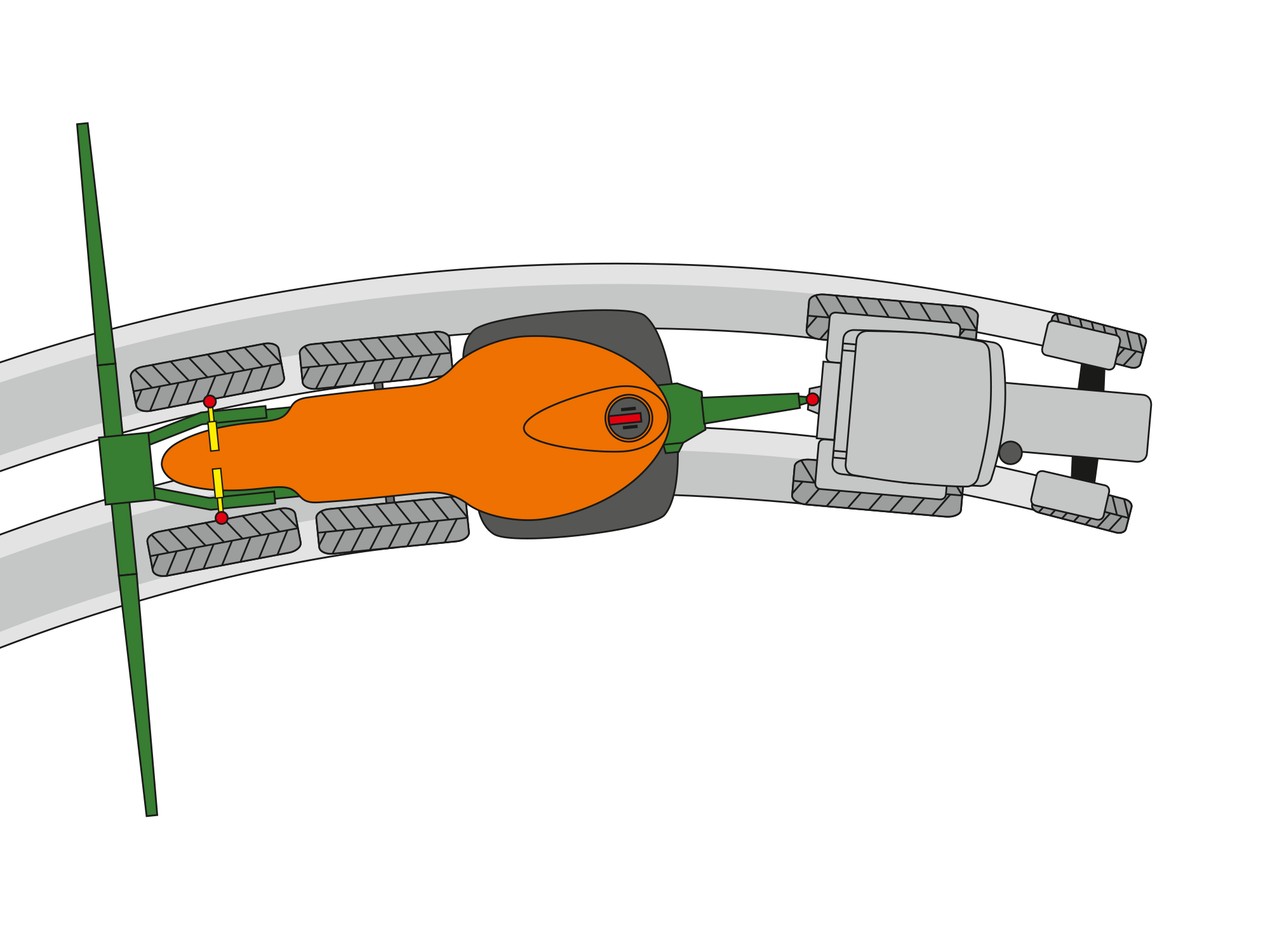 Das Fahrwerk der UX 11201 verfügt serienmäßig über eine nachlaufgelenkte Hinterachse für gutes Fahrverhalten und geringe Spurschäden. Bei der SingleTrail-Nachlauflenkung ist die erste Achse starr und die zweite Achse gelenkt und passiv nachlaufend, sodass sich ein sehr gutes Fahrverhalten ohne „Radieren“ der Räder ergibt.