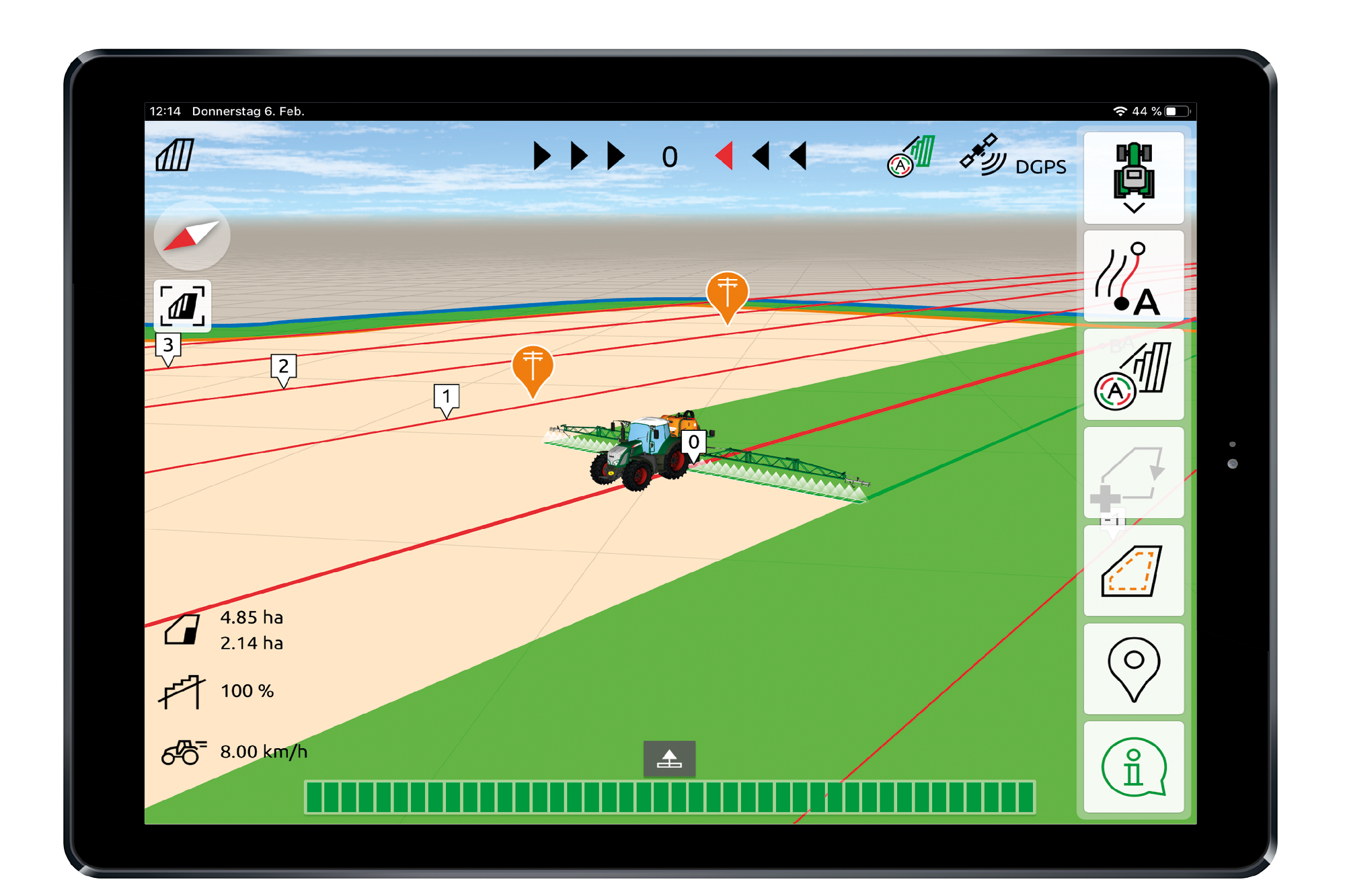 If the operating terminal features Section Control, such as, for example, GPS-Switch part-width section control from AMAZONE, the switching of the part-width sections can be carried out completely automatically and in relation to the GPS position. Once a field has been created, and then in automatic mode, the driver can concentrate fully on the operation of the towing vehicle, since the part-width sections are switched automatically in wedge shaped fields and on headlands.