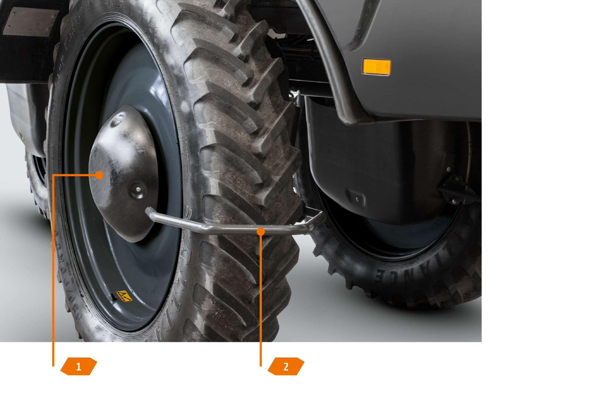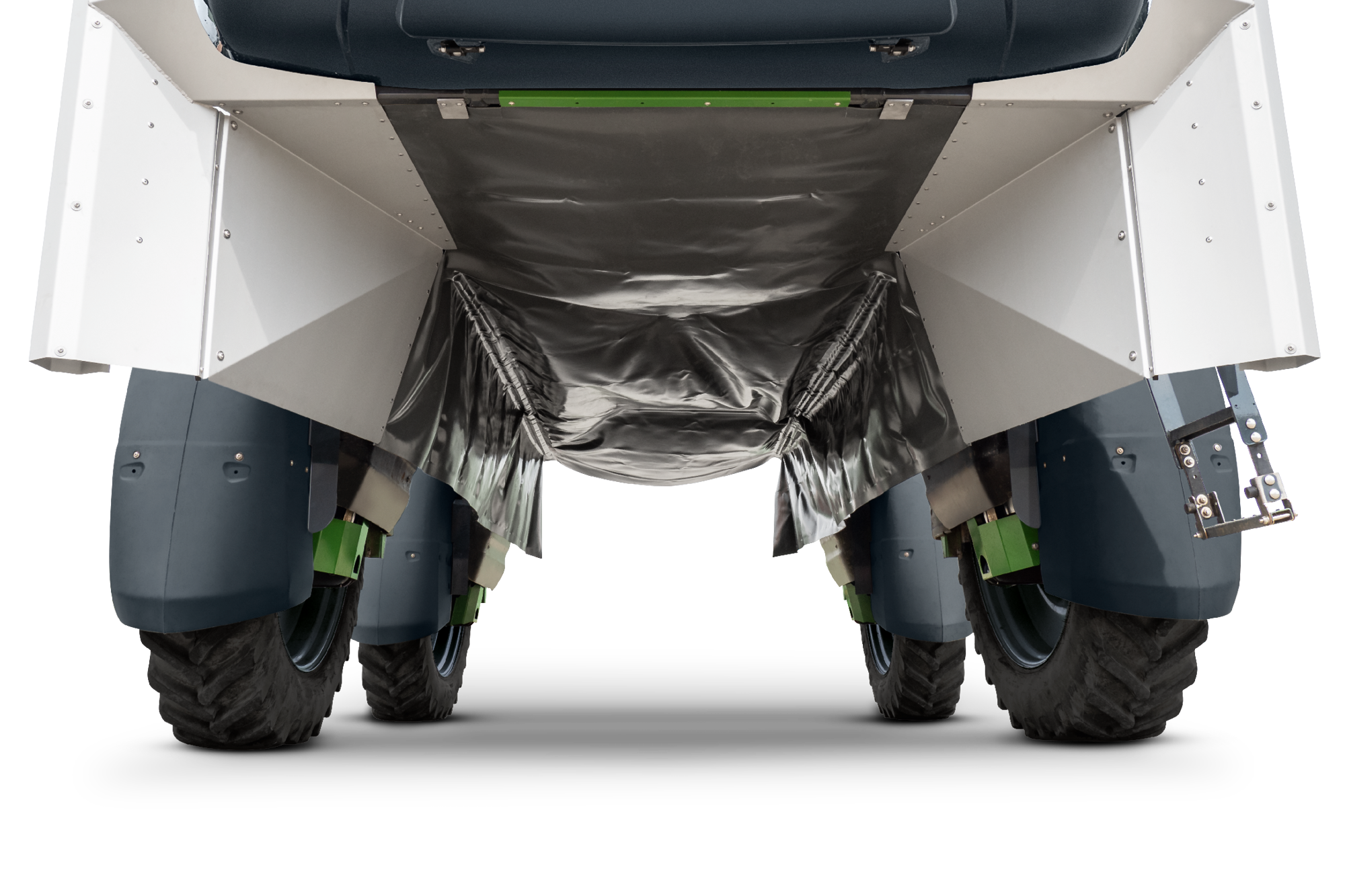 The crop dividers precisely separate the plants between the rows directly in front of the tyres. Thanks to the profile of the underbelly sheet and the properties of the flexible material, the sunflowers gently slide under the machine without hindrance.