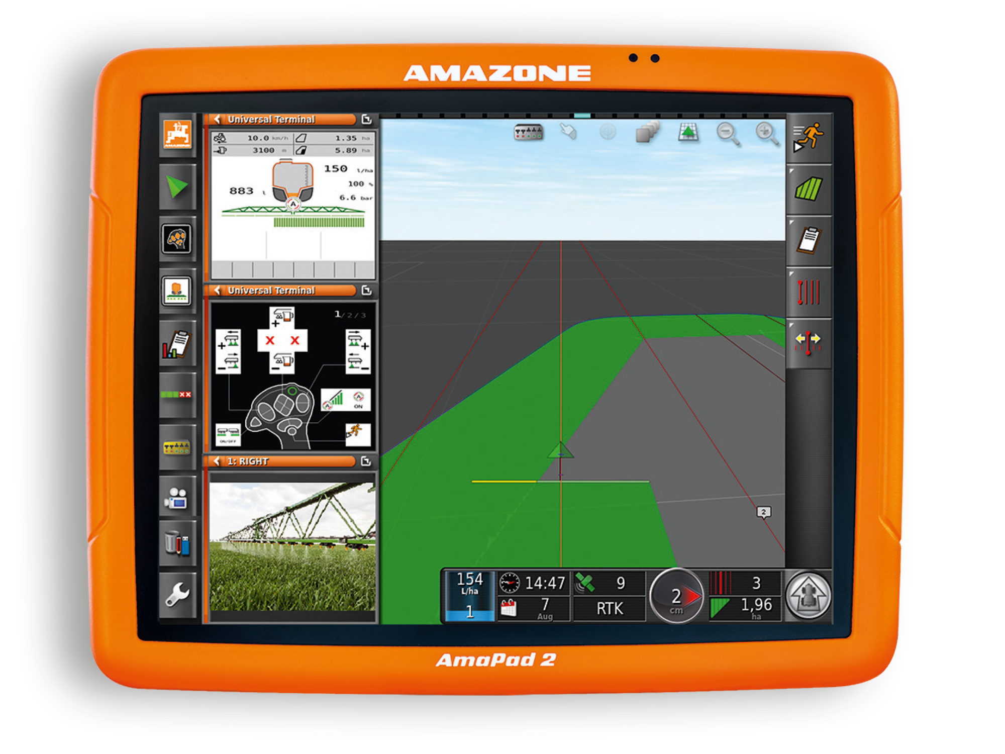 If the operating terminal features Section Control, such as, for example, GPS-Switch part-width section control from AMAZONE, the switching of the part-width sections can be carried out completely automatically and in relation to the GPS position. Once a field has been created, and then in automatic mode, the driver can concentrate fully on the operation of the towing vehicle, since the part-width sections are switched automatically in wedge shaped fields and on headlands.