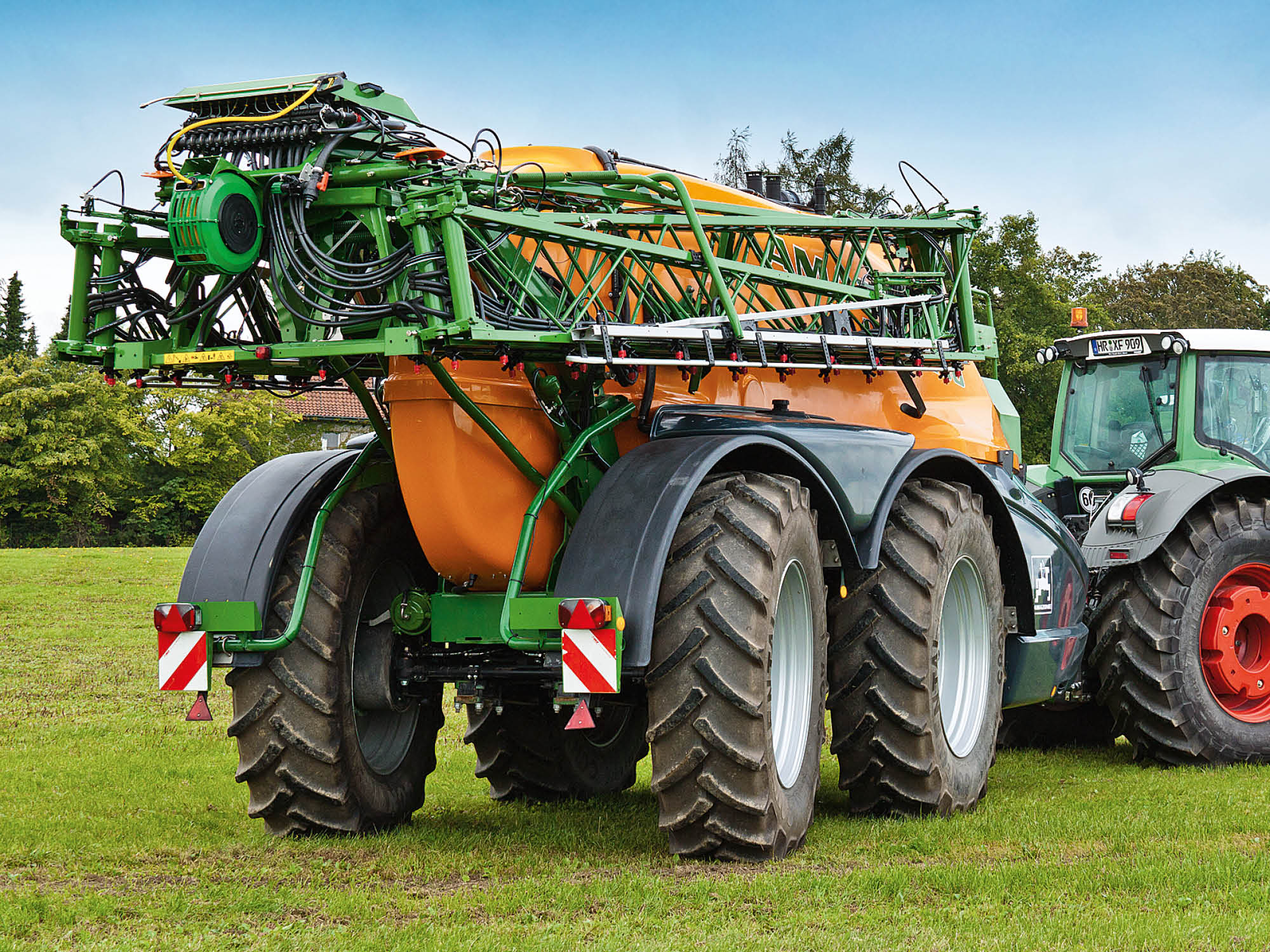 The first axle now runs consistently in the tracks of the tractor rear wheels and the second axle follows the tracks of the tractor front wheels. A high level of directional stability with respect to the tractor is achieved and, more importantly, the sprayer boom is not negatively affected by the steering movements. During road transport, the first axle is locked and the second axle is actively steered by the system.