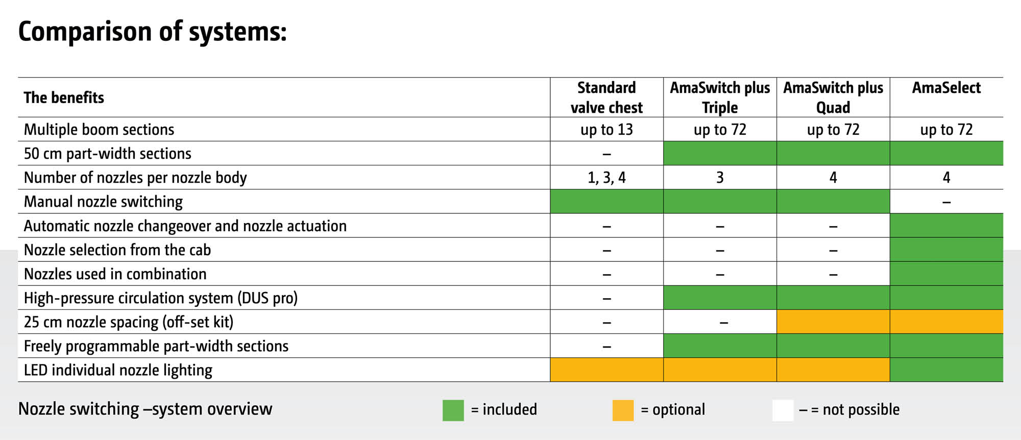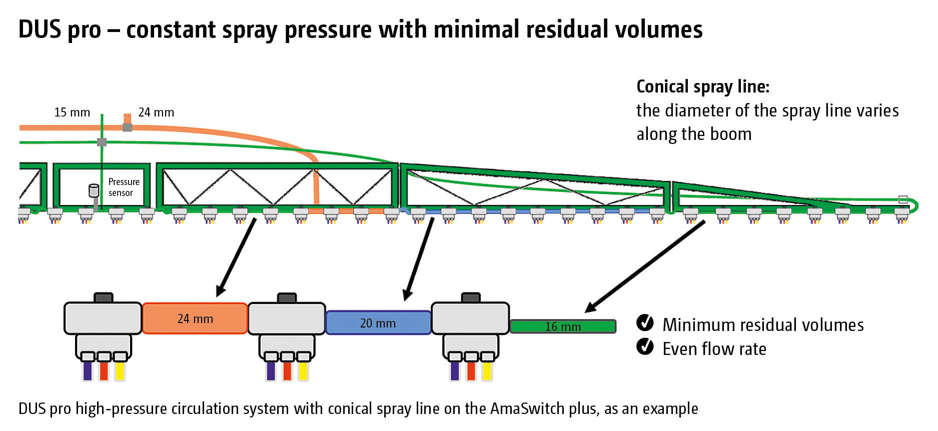 Every time individual part-width sections are shut off when turning and during transport, the spray agent continues to circulate thanks to the pressure recirculation system. This reliably prevents deposits, blockages or segregation in the spray lines.