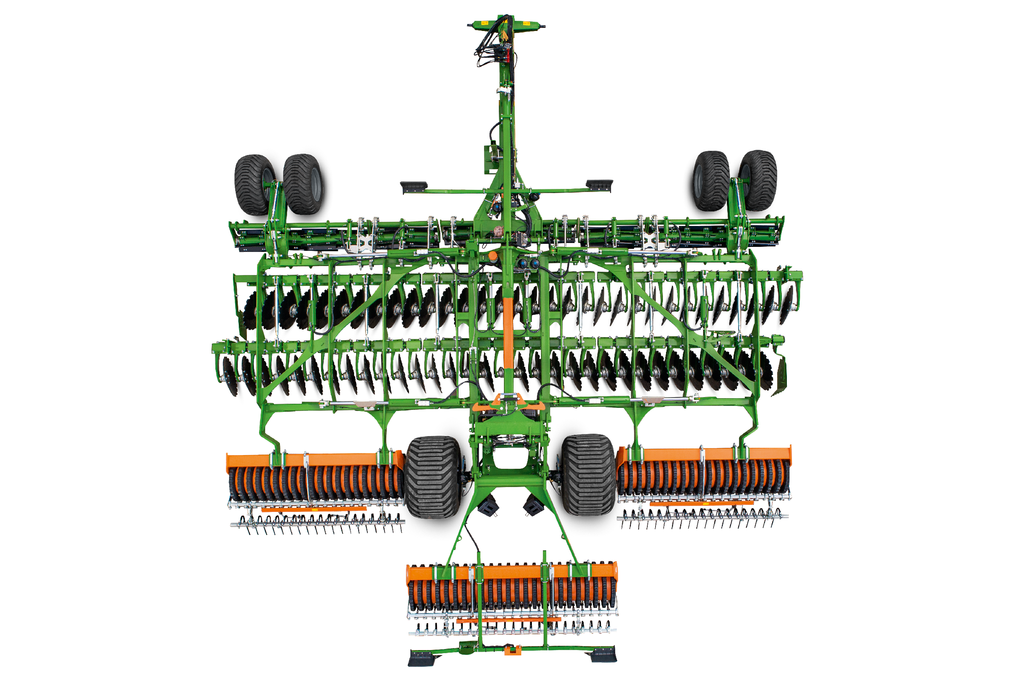 The basic specification of the Catros-2TX trailed machines in working widths of 7 m, 8 m, 9 m and 12 m includes the central running gear with a centre section and outer wing sections. The central running gear is characterised by its smooth running, as the centre section is guided via the tractor axle and the roller, and the outer sections are guided via the support wheels and the packer rollers. The weight acts on the disc sections improving the penetration in hard ground. On public roads, the centre running gear with its wide tyres ensures comfortable transport. The Catros-2TX is extremely manoeuvrable due to this central running gear.
