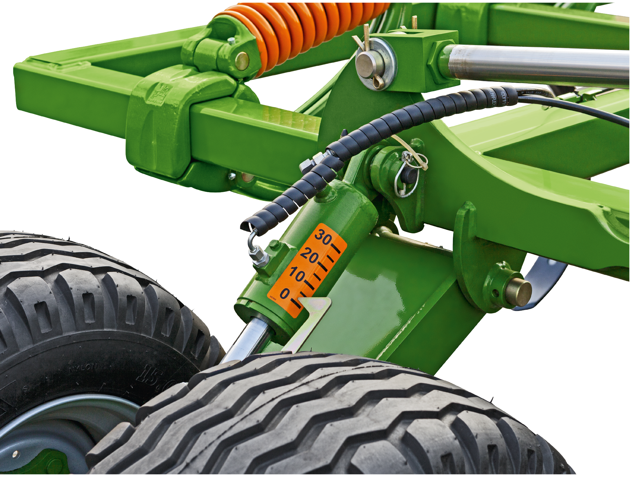 If it is intended to adjust the working depth whilst on-the-move to react to varying soil conditions or to repair harmful compaction, the optional fully hydraulic working depth adjustment is recommended. The working depth adjustment is carried out hydraulically via the support wheels and the rear roller as an option. Manual working depth adjustment via spindles is also available as an alternative.