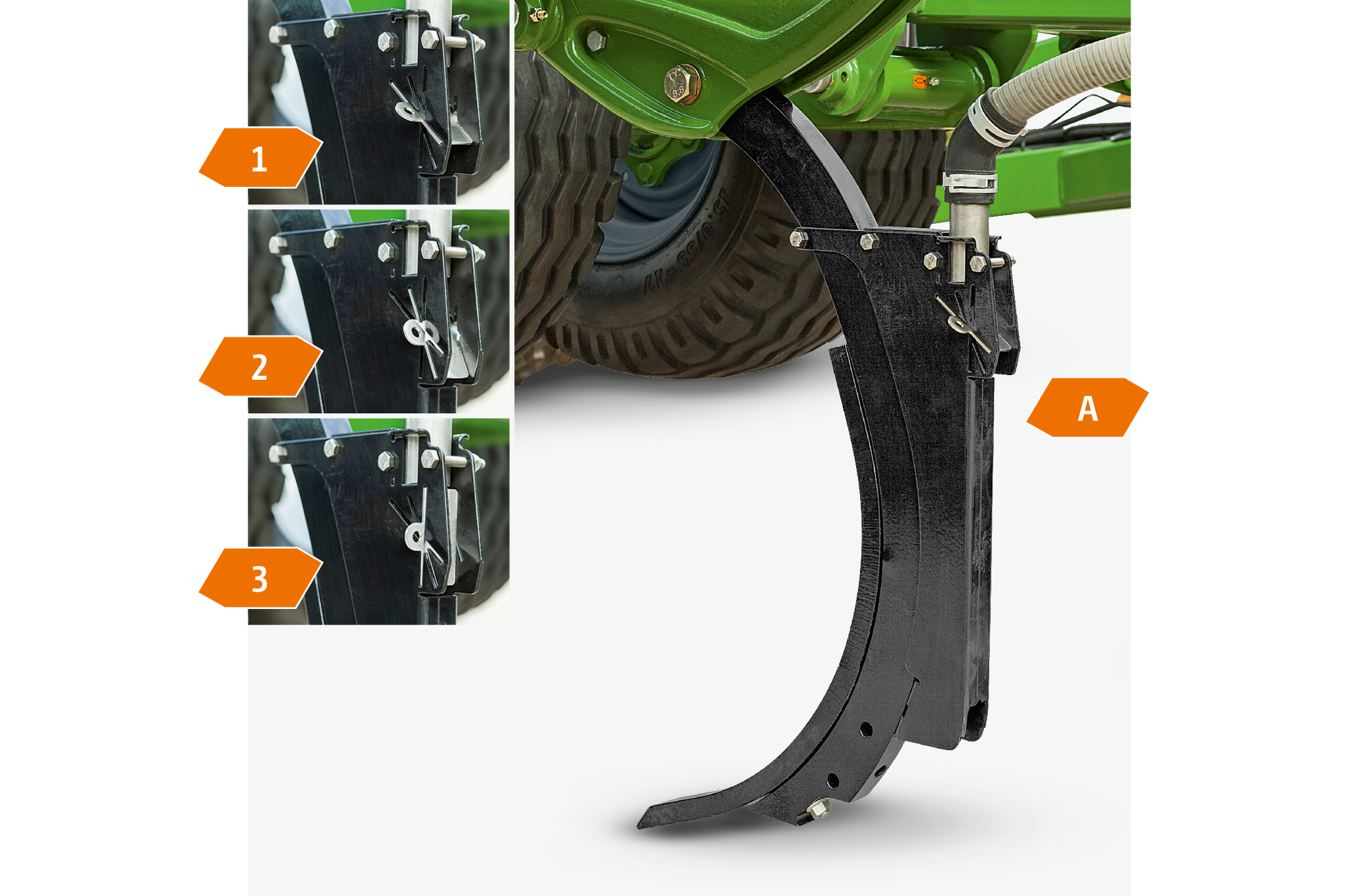Fertiliser application tines with 40 mm wide C-Mix coulter for applying seed or fertiliser directly into the loosened soil, with outlet position setting 1) 100% on top with outlet A, with outlet setting 2) 50% on top with outlet A and 50% underneath at outlet B, and with outlet setting 3) 100% underneath with outlet B.