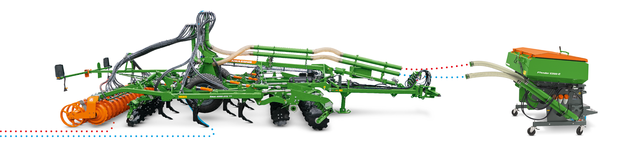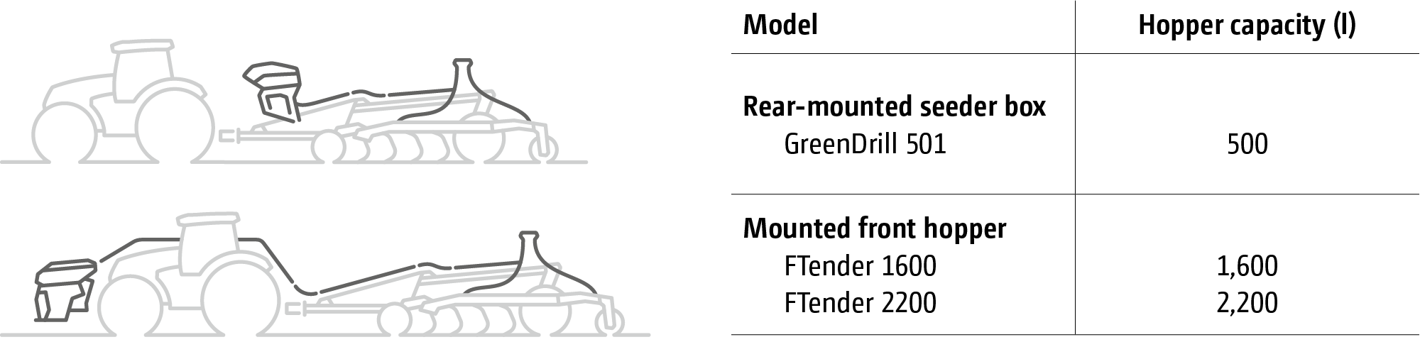 The universal conveying system enables you to combine the Ceus with various different sowing systems. The GreenDrill 501, with its 500 l hopper capacity, can be used in exactly the same way as the front or rear tanks with their respective capacities of 1,600 to 2,200 l. In addition to sowing catch crops, other seeds or even mineral fertilisers and micro-granules can be applied.