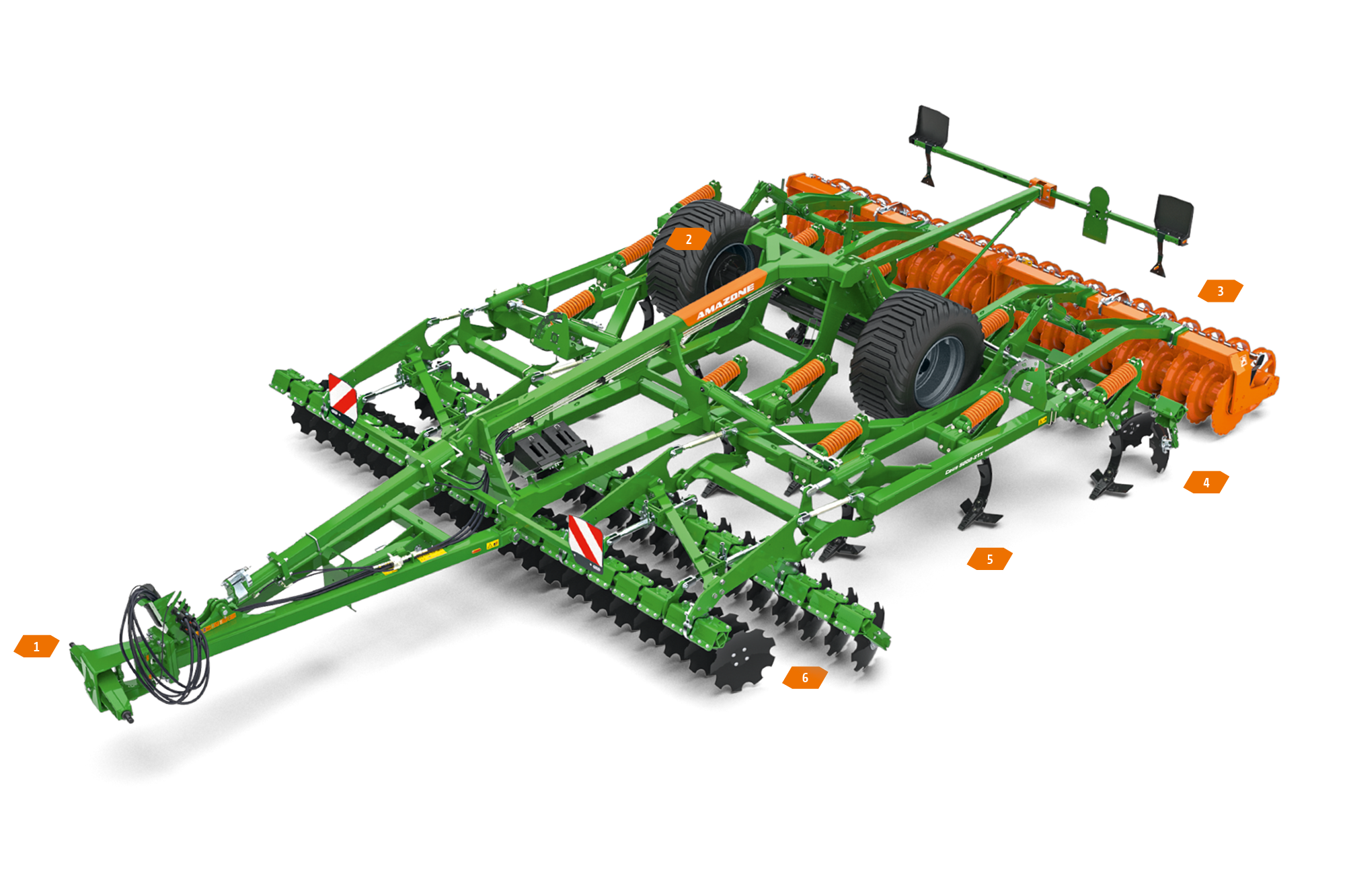 Maximum flexibility and efficiency in a single soil tillage implement – that is the Ceus from AMAZONE. The combination of discs and tines, together with the levelling unit and rear roller, facilitates soil tillage and seedbed preparation in a single pass: The discs cut, chop and intensively mix any organic matter. The tines loosen compaction in the subsoil and complete the mixing process. The levelling unit levels the soil, which is then crumbled and reconsolidated by the rear roller. This prevents the soil from drying out and leaves it ready for sowing.