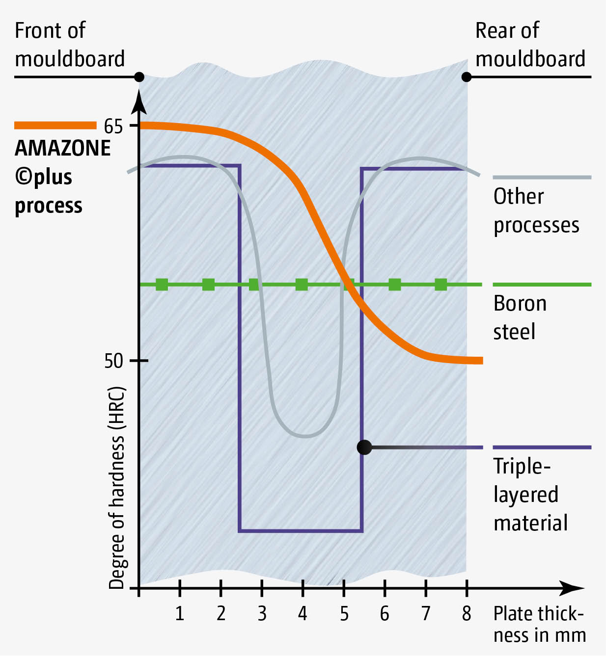 Carbon in its purest form, diamond, is the hardest naturally occurring substance. A hardening process which involves introducing carbon into the steel is used to increase the hardness and durability of ©plus wearing parts. AMAZONE uses a unique hardening process to achieve a very high level of hardness on the front of components, such as the shin, to produce the optimum resistance to wear. The back remains relatively soft but at the same time extremely tough and impact resistant.