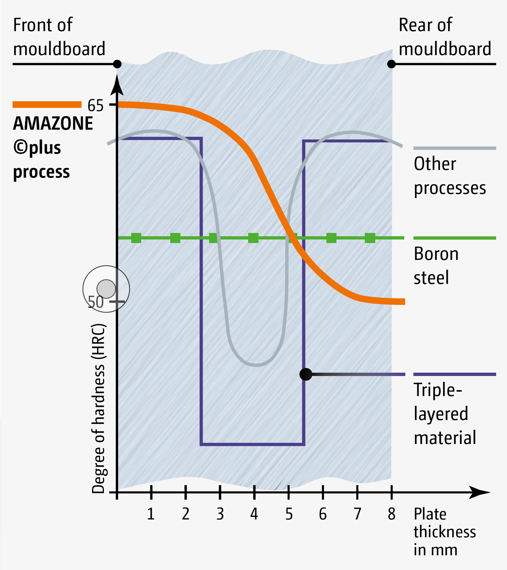 The basis for the economical use of a plough is, of course, by keeping the required pulling force to a minimum, thus reducing the fuel consumption. In combination with the unique ©plus hardening process which gives very hard and smooth surfaces, the clever design guarantees the ease of pulling for which AMAZONE ploughs are renowned. All plough bodies come equipped with our specially designed points. The special profile gives less resistance and smoother draft. The self-sharpening area has been made much thicker, thus considerably increasing the life of the ploughshare.