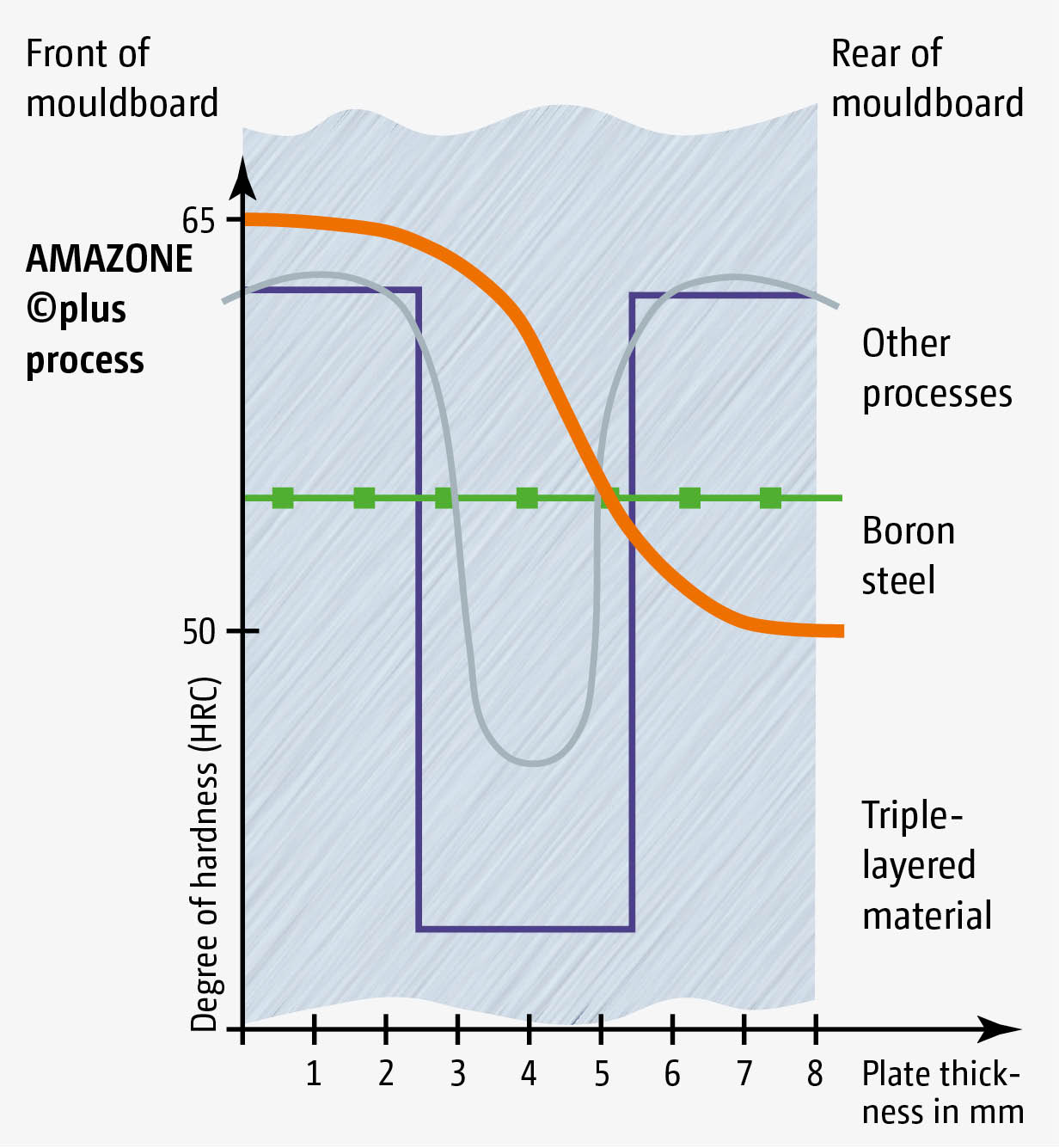 Carbon in its purest form, diamond, is the hardest naturally occurring substance. A hardening process which involves introducing carbon into the steel is used to increase the hardness and durability of ©plus wearing parts. AMAZONE uses a unique hardening process to achieve a very high level of hardness on the front of components, such as the shin, to produce the optimum resistance to wear. The back remains relatively soft but at the same time extremely tough and impact resistant.