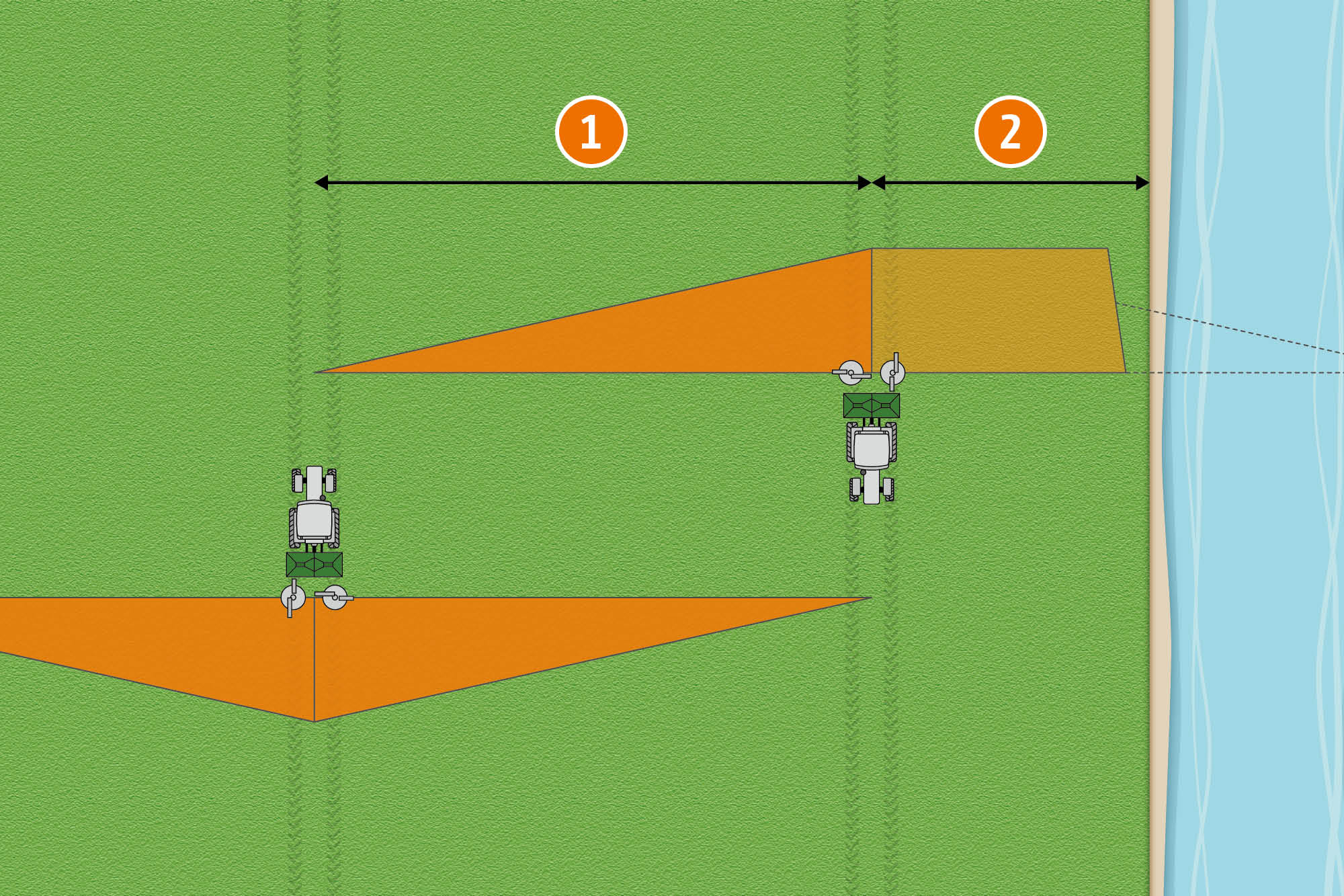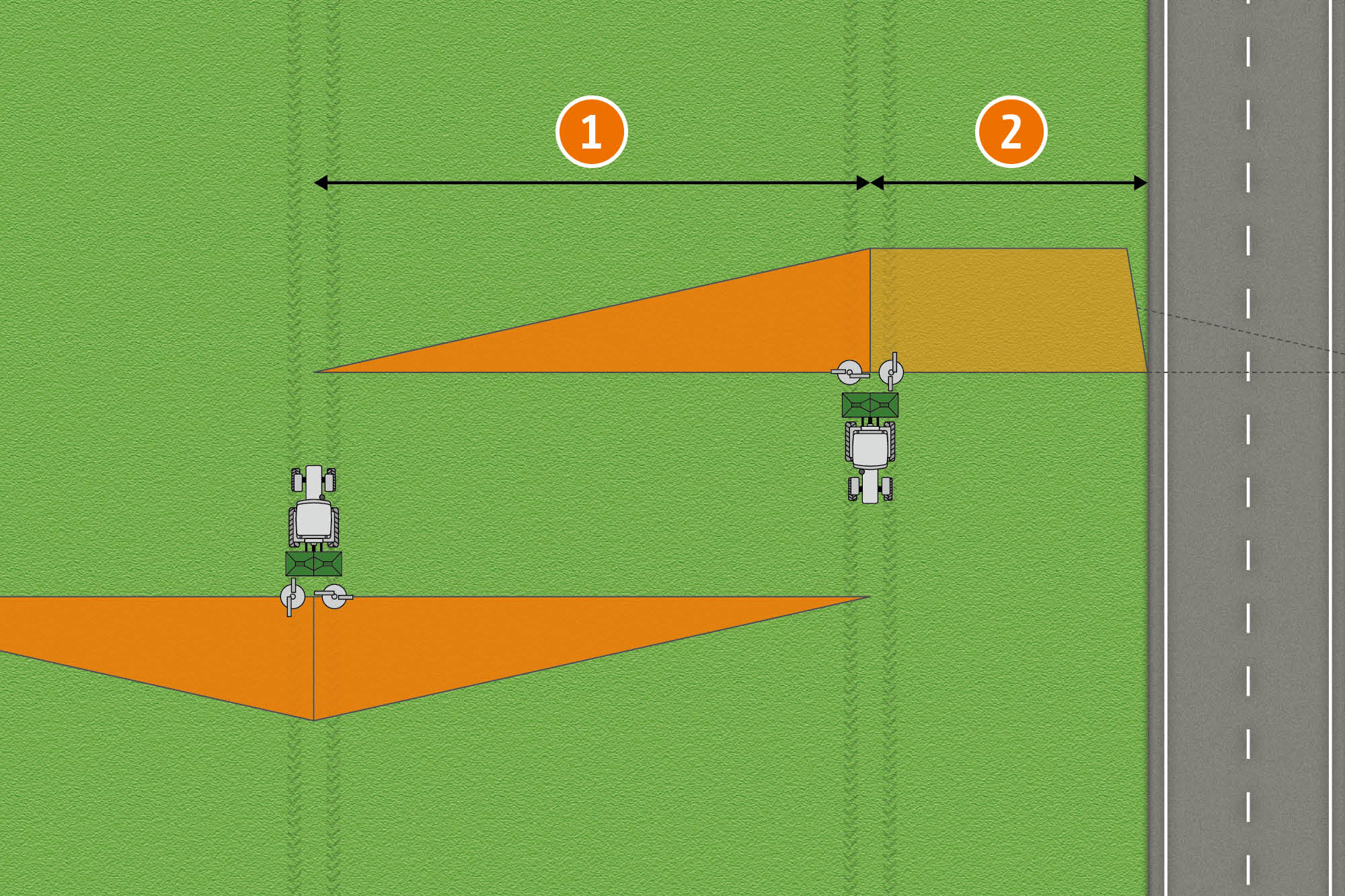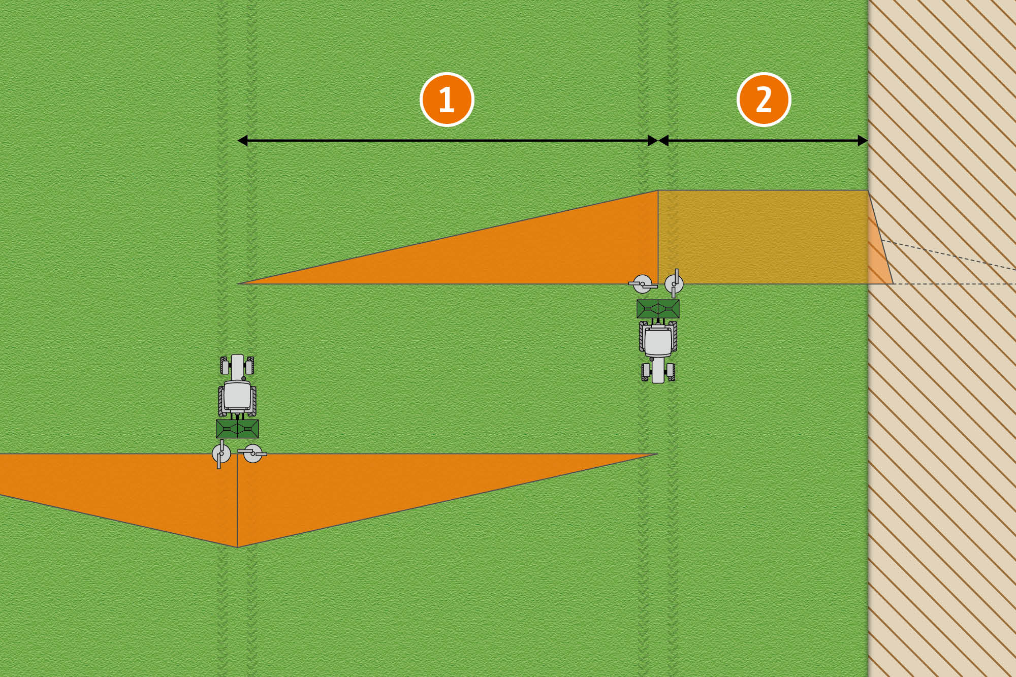 - In the subsequent tramlines, normal spreading is resumed with 100% of the target rate to both sides.