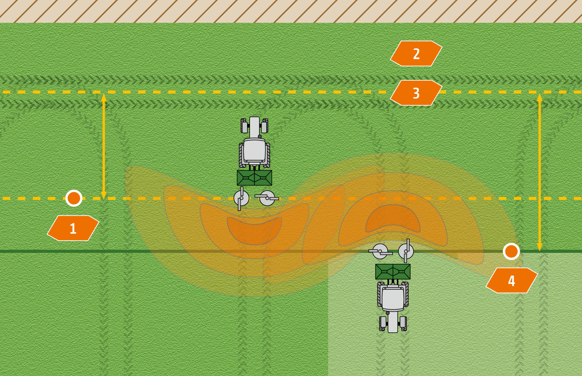 If the operating terminal features Section Control, such as, for example, GPS-Switch part-width section control from AMAZONE, the switching of the part-width sections can be carried out completely automatically and in relation to the GPS position. Once a field has been created, the driver can concentrate fully on operating the vehicle in automatic mode, since the part-width sections are switched automatically in wedge shaped fields and on headlands.